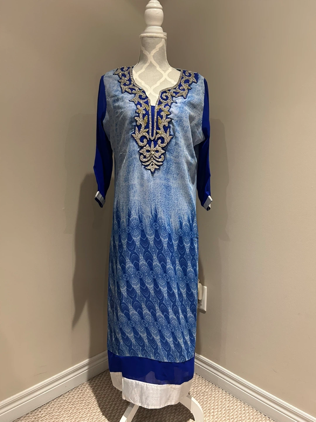 Beautiful blue dress with intricate embroidery around the neckline. It's in great condition and ready for a new home! The dress features a unique pattern and is perfect for a special occasion or everyday wear
