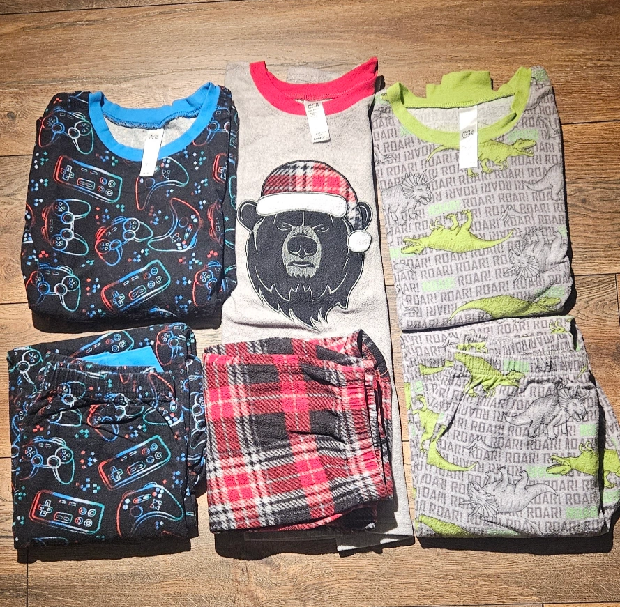 Selling three sets of gently used kids pajamas in size XL. One set features a fun video game controller print, another has a cute bear with a Santa hat, and the third has a dinosaur theme. Perfect for keeping your little one cozy!