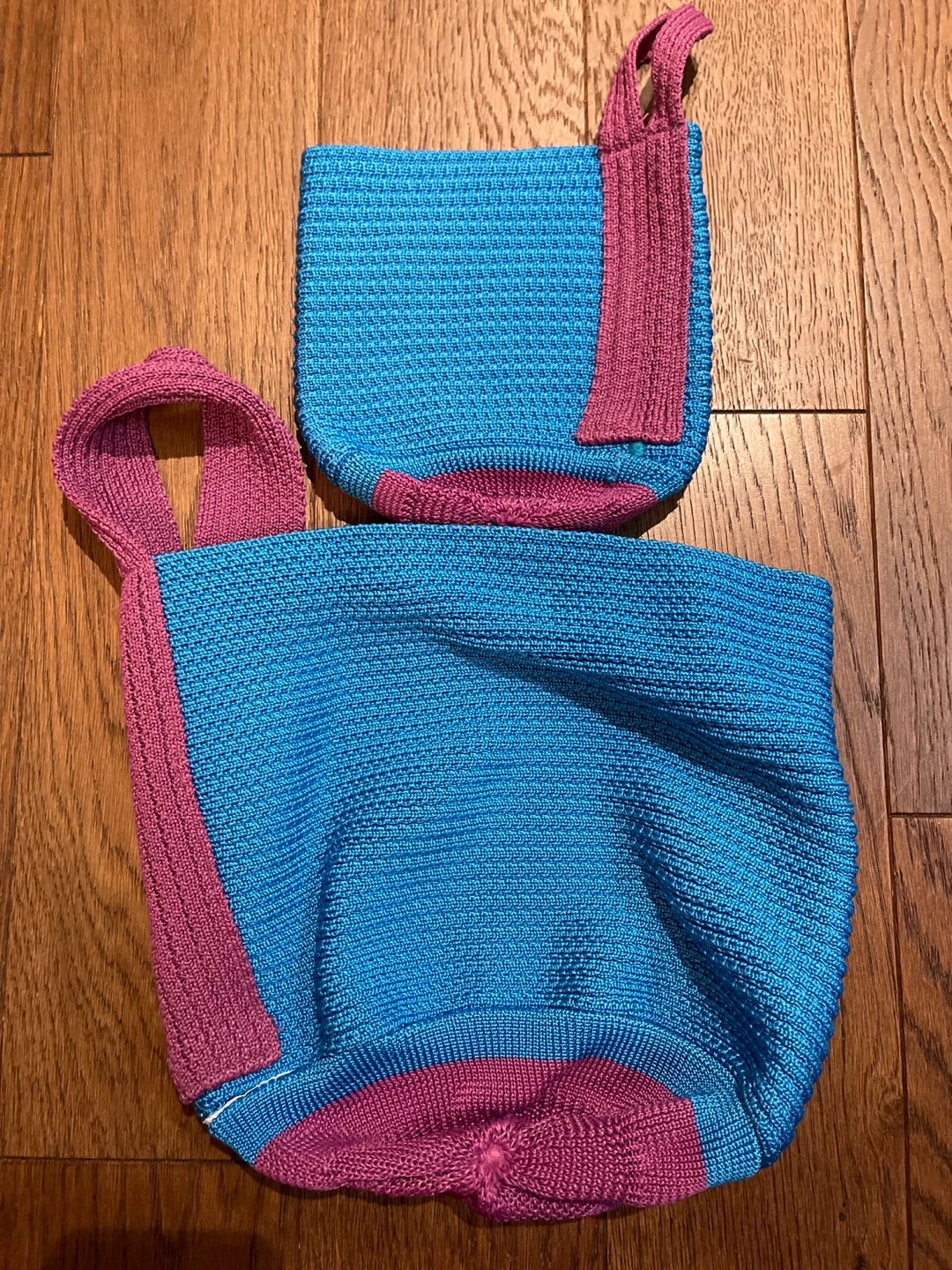 Selling a set of two cute knitted tote bags! They are blue with purple accents and have a unique textured design. Perfect for carrying groceries or everyday essentials