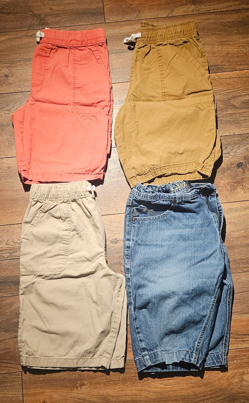 Selling a bundle of four pairs of kids' shorts. Includes a coral pair, a khaki pair, a light beige pair, and a denim pair. All in great condition and ready for summer!