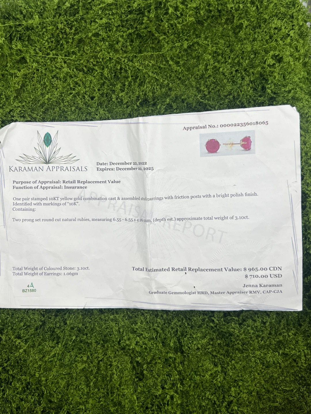 Total Estimated Retail Replacement Value: $965.00 CDN