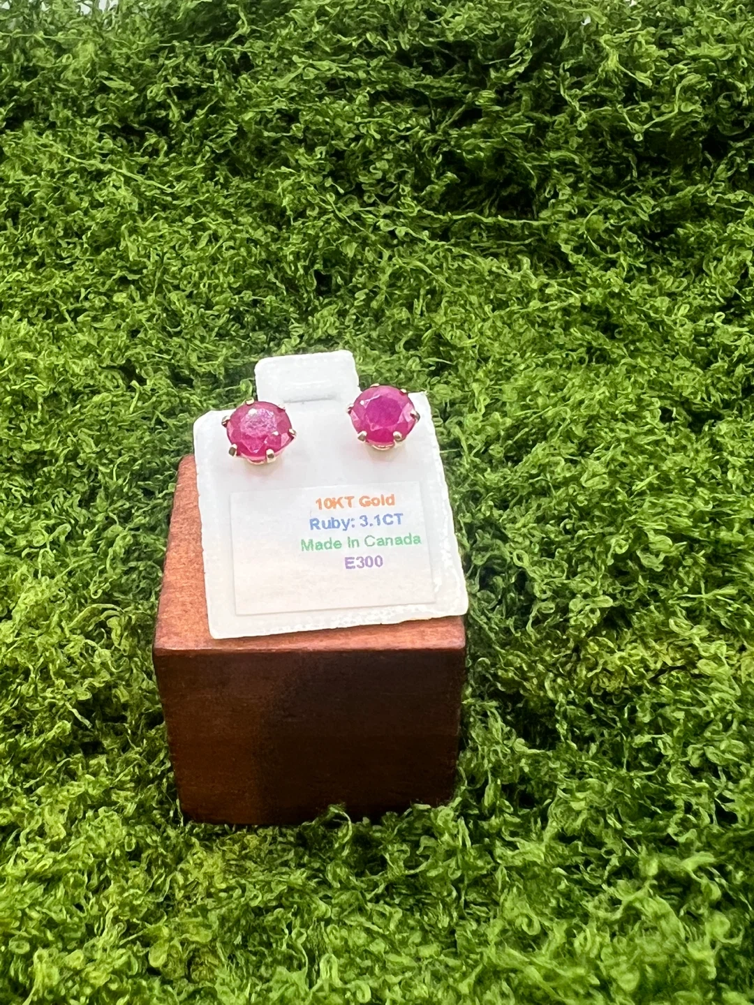 Selling a pair of beautiful 10KT gold ruby earrings, proudly made in Canada! These earrings feature round cut natural rubies, approximately 3.10ct in total weight. The earrings are stamped with '10k'.