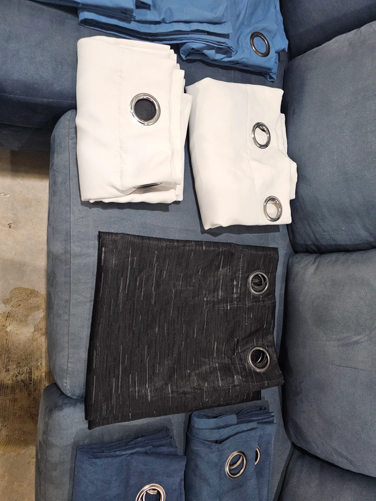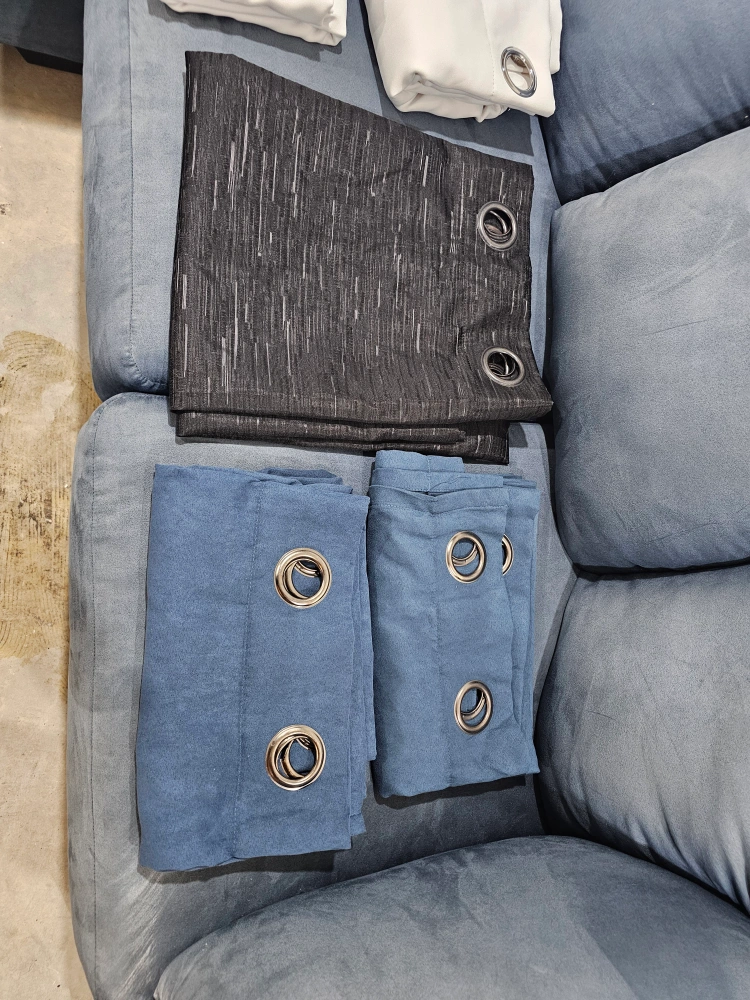 Selling a set of curtains. There are blue, white, and blackout curtains available. They are in good condition and ready to add some style to your home