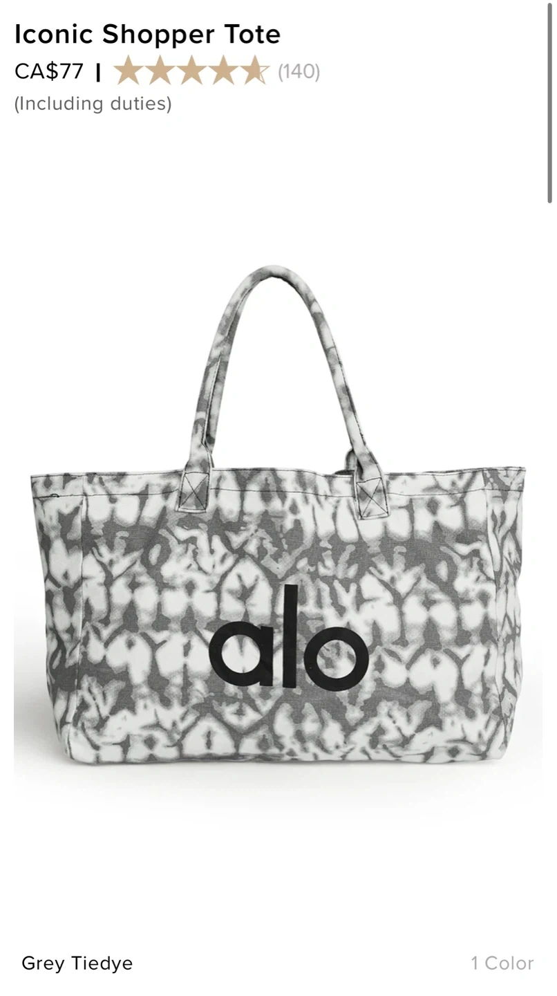Selling a brand new ALO Yoga Iconic Shopper Tote in a stylish grey tie-dye pattern! This tote is perfect for carrying your essentials, whether you're heading to yoga class, Pilates, gym or running errands around town. It's in excellent condition, with the original tag still attached. Retails for $77 CAD!