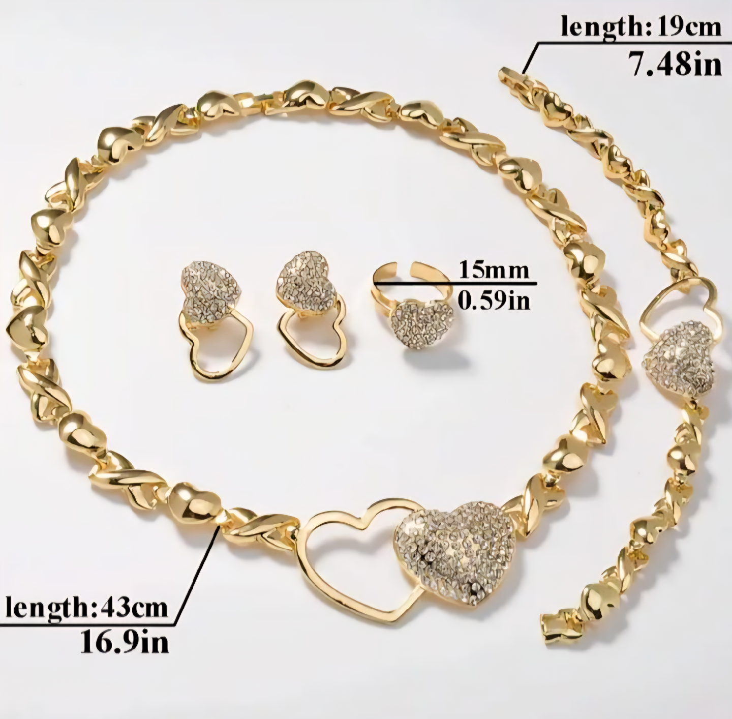 Beautiful high quality 14k GP jewelry set featuring a heart design. Includes a necklace (43cm/16.9in), bracelet (19cm/7.48in), ring (15mm/0.59in), and a pair of earrings. Perfect for adding a touch of sparkle to any outfit! Made with high quality materials. no tarnishing or fading