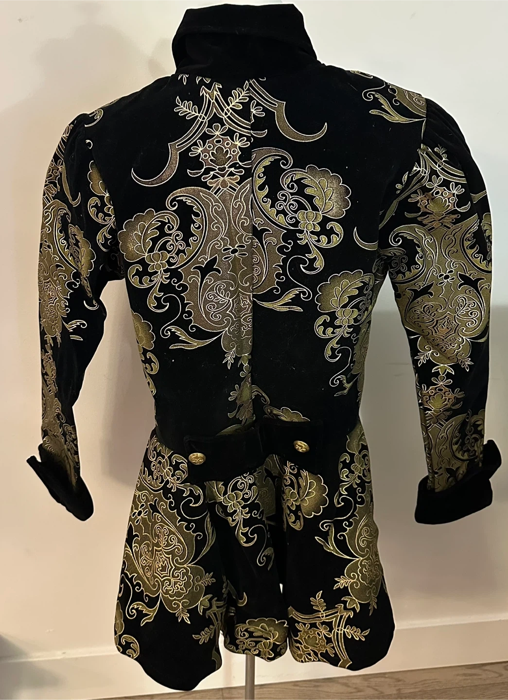 86Selling a Charades Elegant Pirate Lady costume blazer in size Large. It includes a velvet printed jacket. The costume is black with gold detailing.