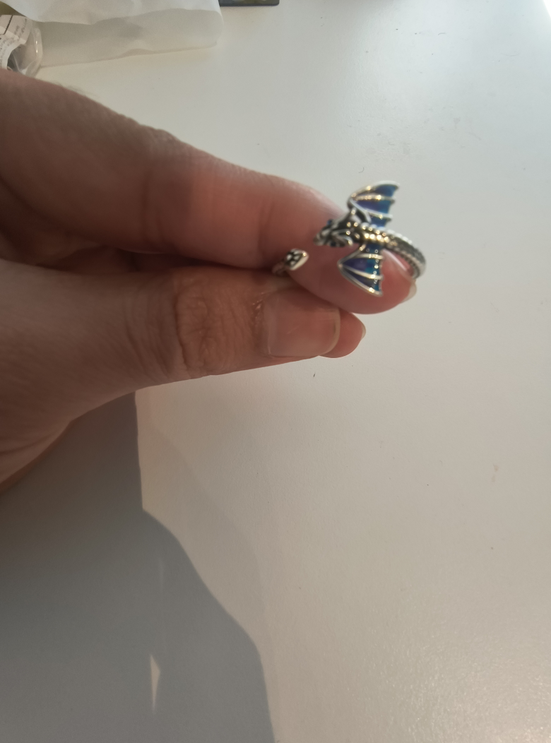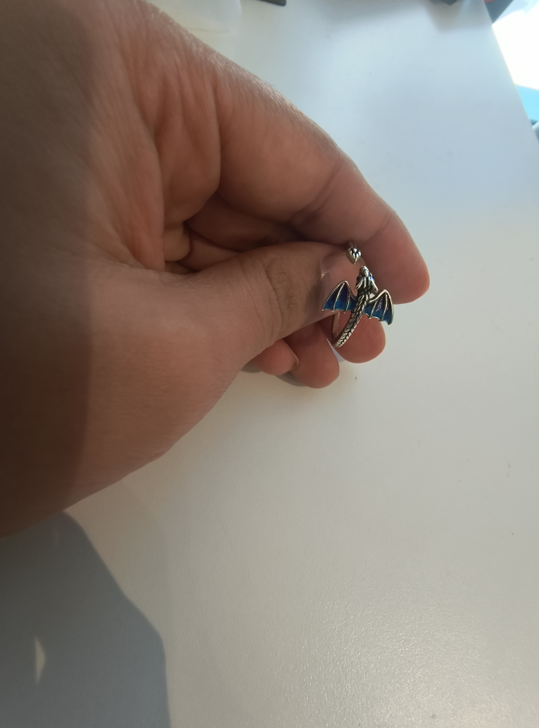 Selling a cool dragon ring! It's adjustable, so it should fit most fingers. The dragon has blue accents on its wings. It's a unique piece of jewelry that's sure to catch the eye