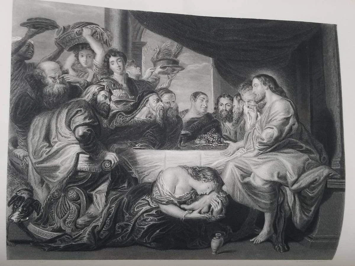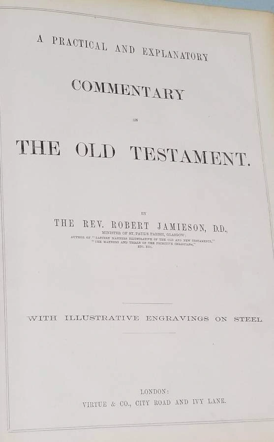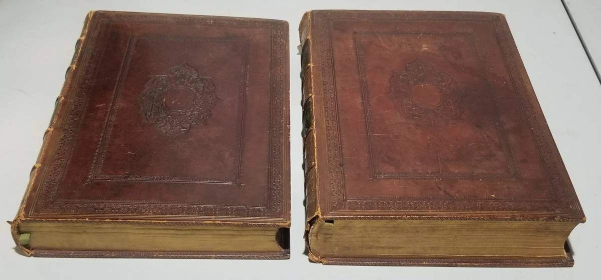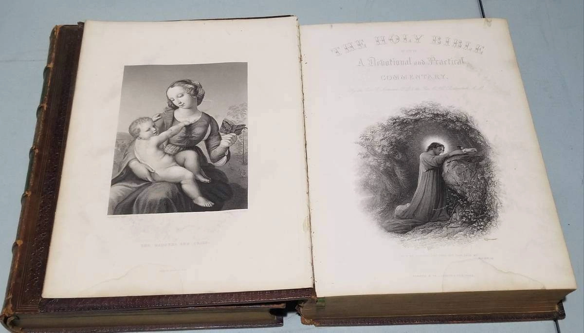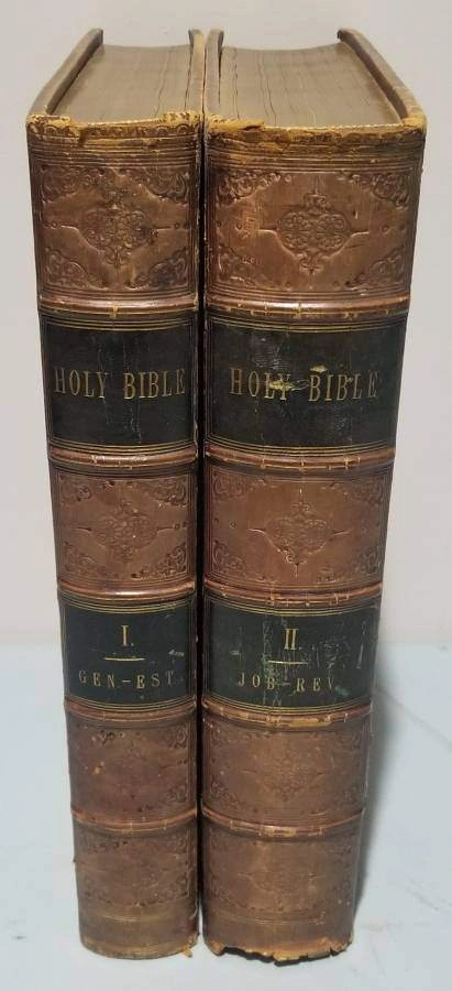 Antique 2-Volume Holy Bible Commentary Set – Virtue & Co. (c. 1860s, Early Canadian Distribution) E-Transfers Accepted Pick Up Anytime A massive and historically important two-volume Holy Bible commentary set, published by Virtue & Co., London & New York, mid-19th century. These deluxe folio Bibles were among the earliest commentary editions distributed in Canada during the Confederation era (1867+), sold by subscription and treasured as family heirlooms. Oversized folio format: approx. 15" tall × 11" wide × 5.5" combined spine width Full Victorian embossed leather bindings with gilt page edges, ornate tooling, and raised bands Illustrated with dozens of full-page steel engravings by major artists of the era (John Martin, Goodall, Corbould, etc.) Family record pages included for births, marriages, and deaths Volume I: Genesis–Esther (thicker) Volume II: Job–Revelation (slimmer) Condition: Both volumes complete with plates and text intact. Leather shows age wear and cracking; bindings are pulling away on the inside and would benefit from professional re-gluing/restoration due to the heavy weight of the books. Engravings remain bright. Historical Significance These monumental editions by Virtue were often the centerpiece of Canadian Protestant households in the late 19th century. Very few matched 2-volume sets survive intact today, making this a rare opportunity to own a piece of Canadian religious and publishing history. antique bible set virtue bible commentary illustrated family bible victorian holy bible canadian confederation era bible steel engraved bible heirloom bible set