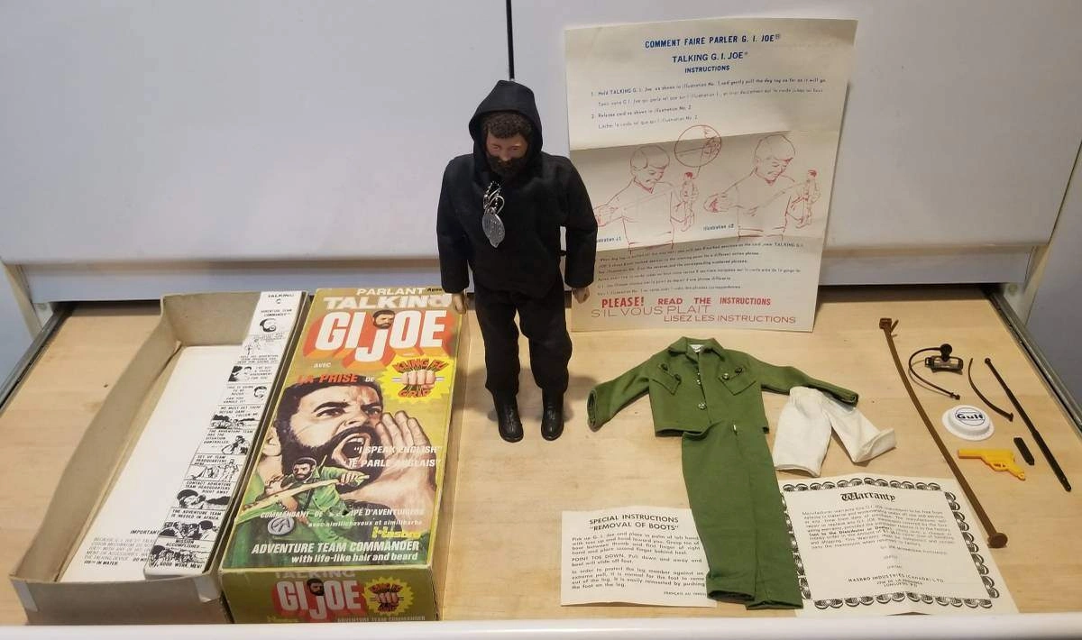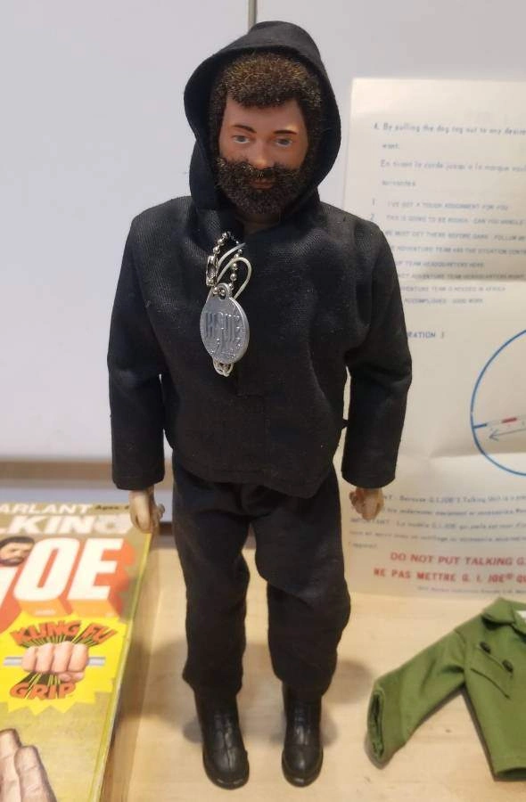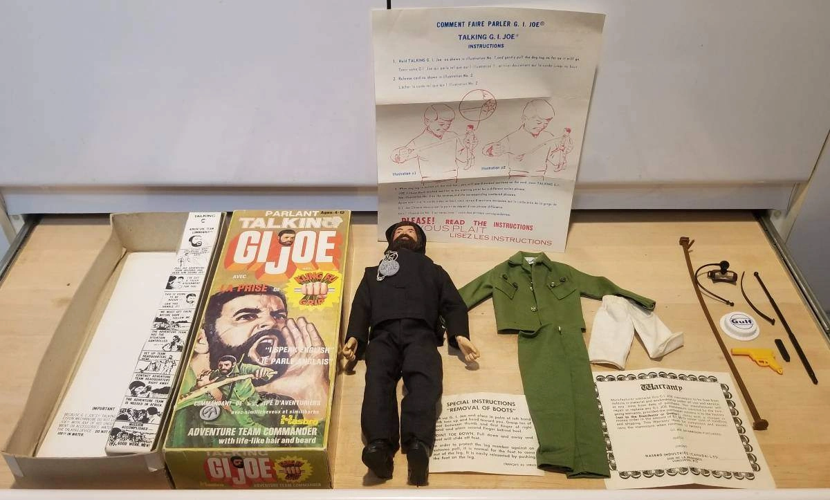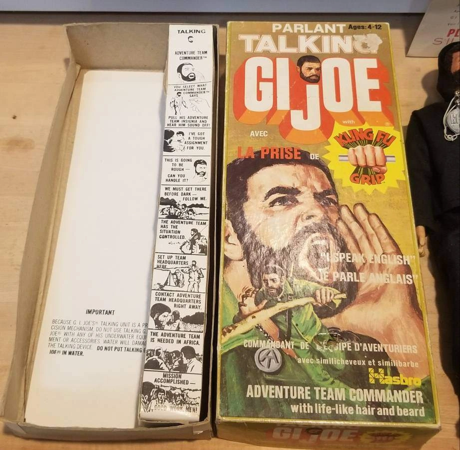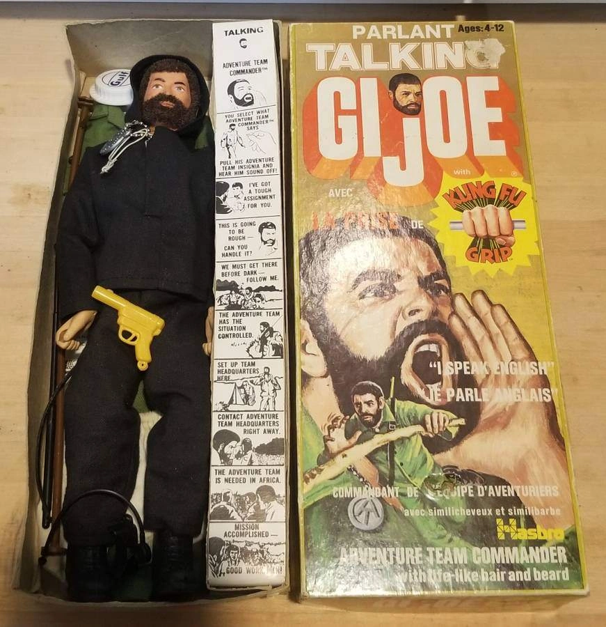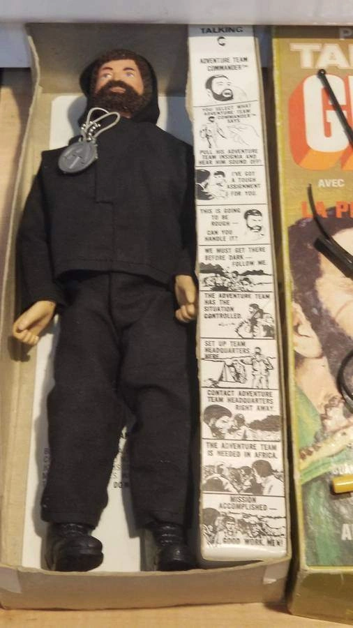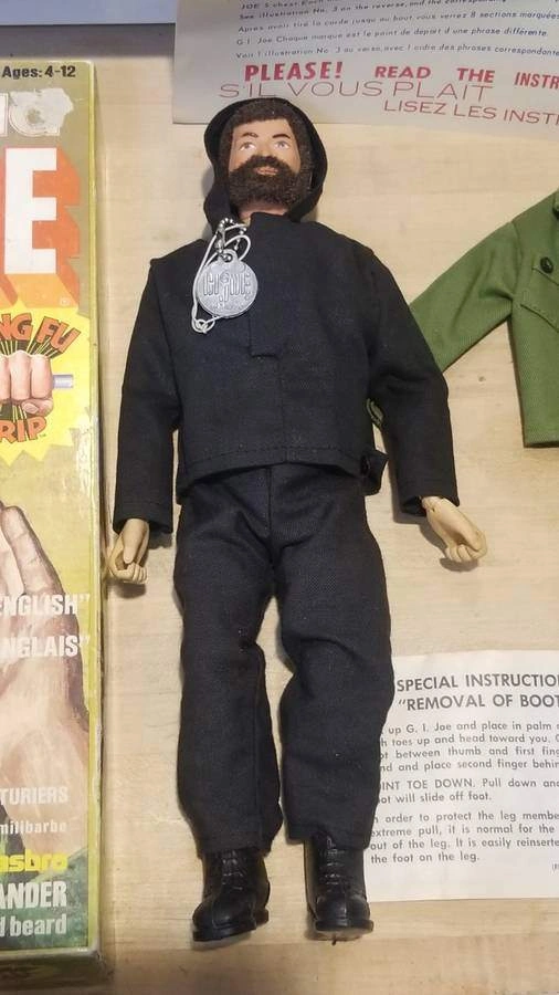 Vintage 1972 Canadian Talking G.I. Joe Adventure Team Commander – Kung Fu Grip – Bilingual Box E-Transfers Accepted Pick Up Anytime Rare 1972 Canadian bilingual edition of the Talking G.I. Joe Adventure Team Commander by Hasbro. This collectible features life-like hair and beard, Kung Fu Grip hands, and an intact talking dog tag pull mechanism (functionality not tested). The box, instructions, and paperwork are all printed in English and French—exclusive to Canadian releases. Included: Original 12" G.I. Joe figure in black outfit with boots Official G.I. Joe metal dog tag on chain Original yellow pistol and black magazine Additional brown and black accessory gear Green uniform set and white underclothing Original bilingual box in strong condition Instruction sheet, special insert, and warranty paper (Hasbro Industries Canada, 1972) This is an excellent and display-ready collector’s piece, complete with hard-to-find packaging and accessories. Suitable for vintage toy collectors, action figure fans, and G.I. Joe enthusiasts. gi joe hasbro vintage toy kung fu grip action figure 1972 canada bilingual adventure team talking rare collectible retro 12”