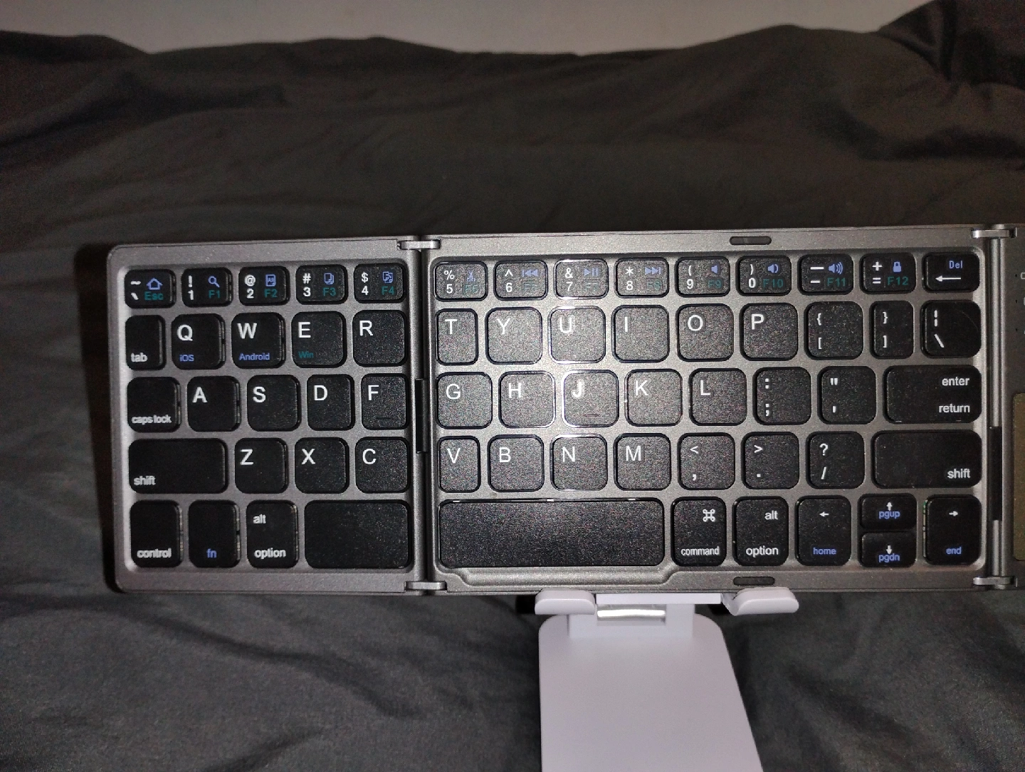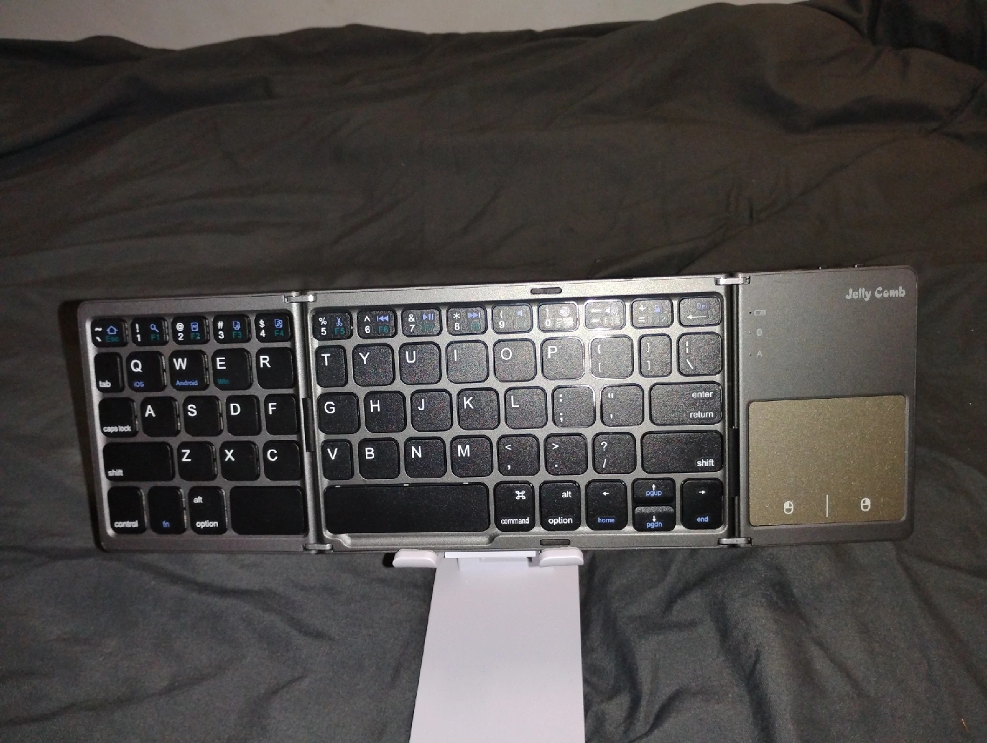 Selling a Jelly Comb folding bluetooth keyboard! It's super lightweight and portable, making it perfect for travel or working on the go. It also has a built-in touchpad for easy navigation