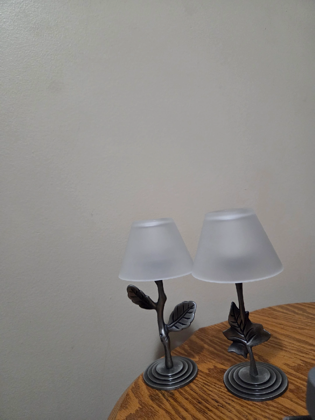 Selling a small accent lamp shape candle holder with a leaf design. It has a frosted glass shade and a metal base. Perfect for adding a touch of whimsy to any room!