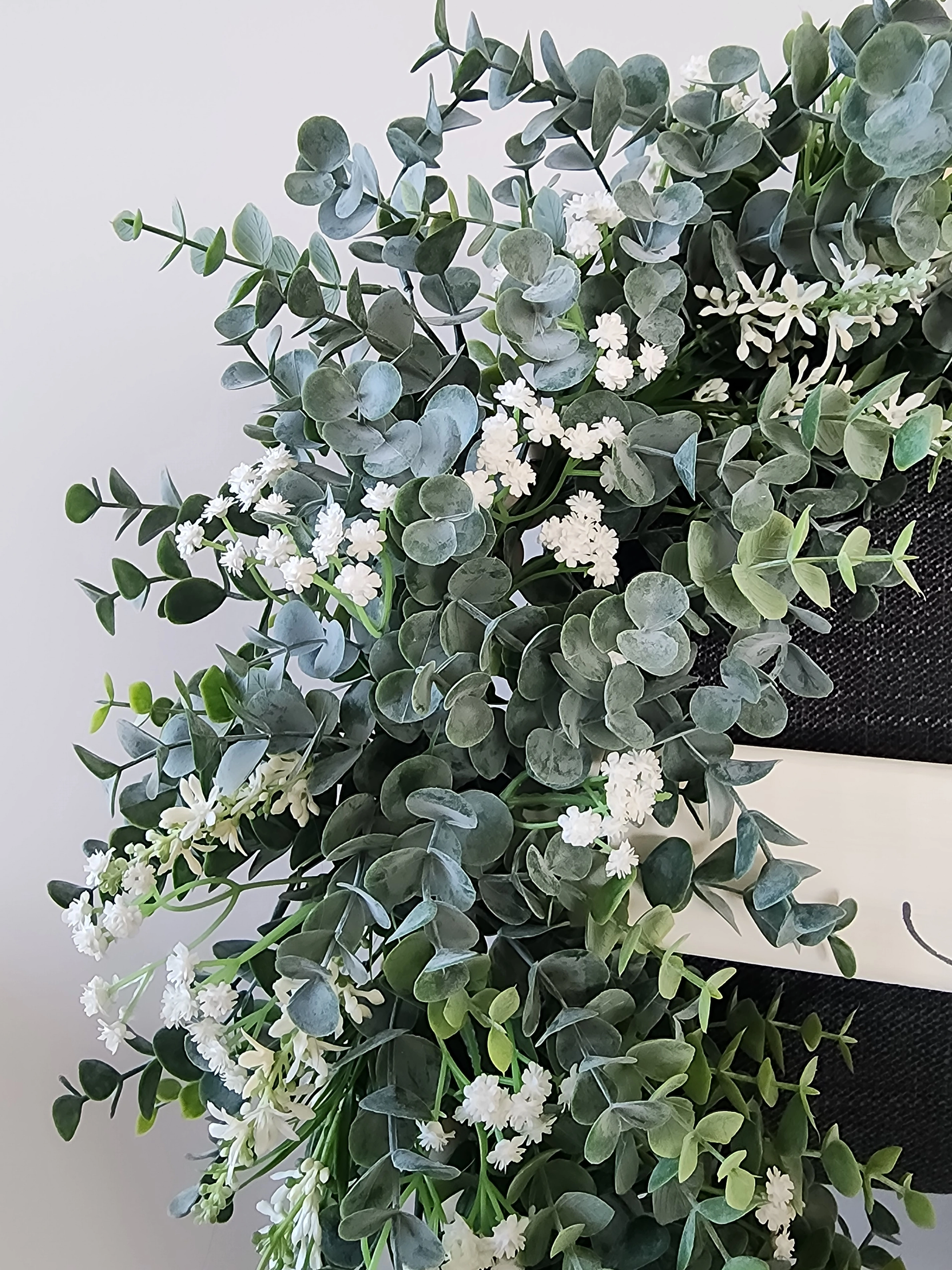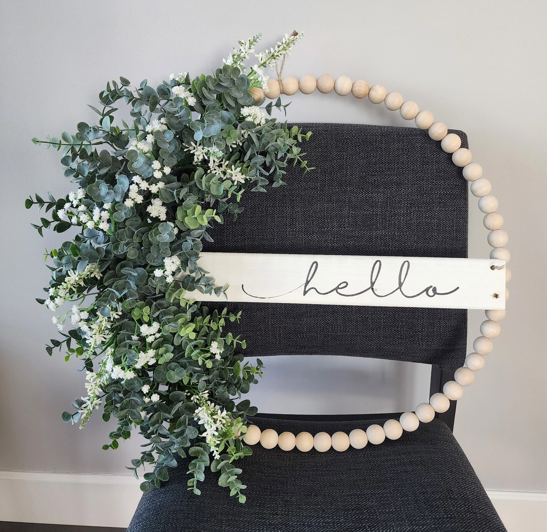10** IF THE AD IS UP, IT’S AVAILABLE ** Beautiful front door wreath by ETSY homecrafter 1” wood beads on an 18” hoop Left side is embellished with realistic looking foliage & white flowers Across the middle is a painted white wood plank with “hello” print Only selling due to change of decor Excellent – like new condition From a smoke-free & no pet home Pickup in Abbotsford (Gladwin & Bevan)
