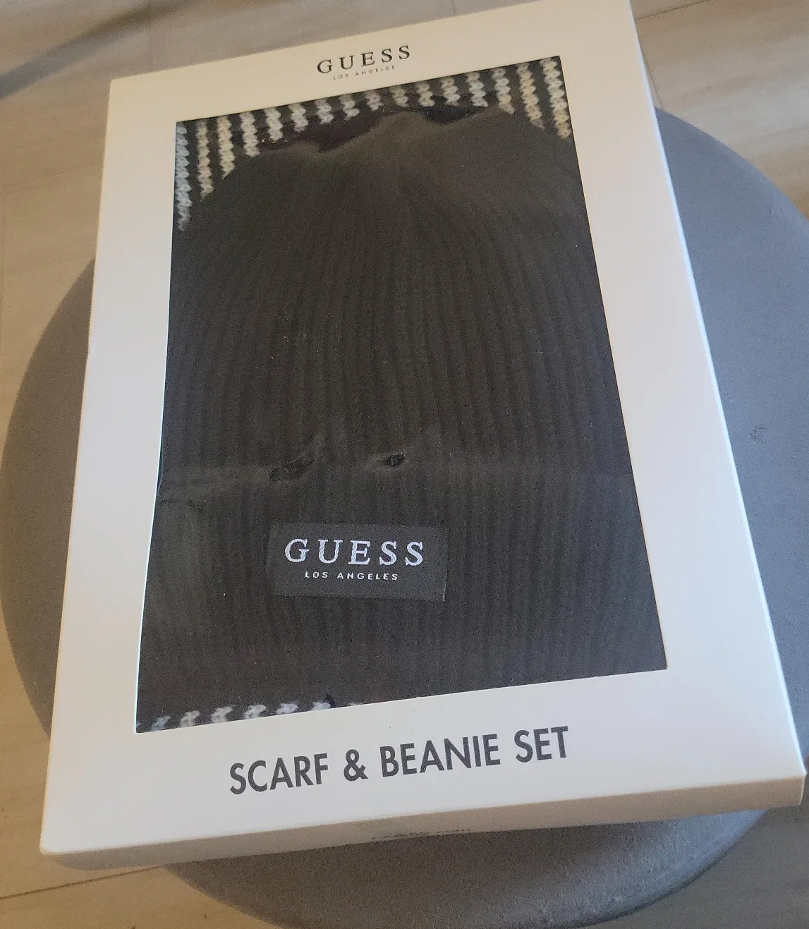Selling a brand new Guess scarf and beanie set, still in its original box! The set includes a cozy beanie and a matching scarf, perfect for staying warm and stylish during the colder months. The set is brand new and has never been used, making it a great gift option as well