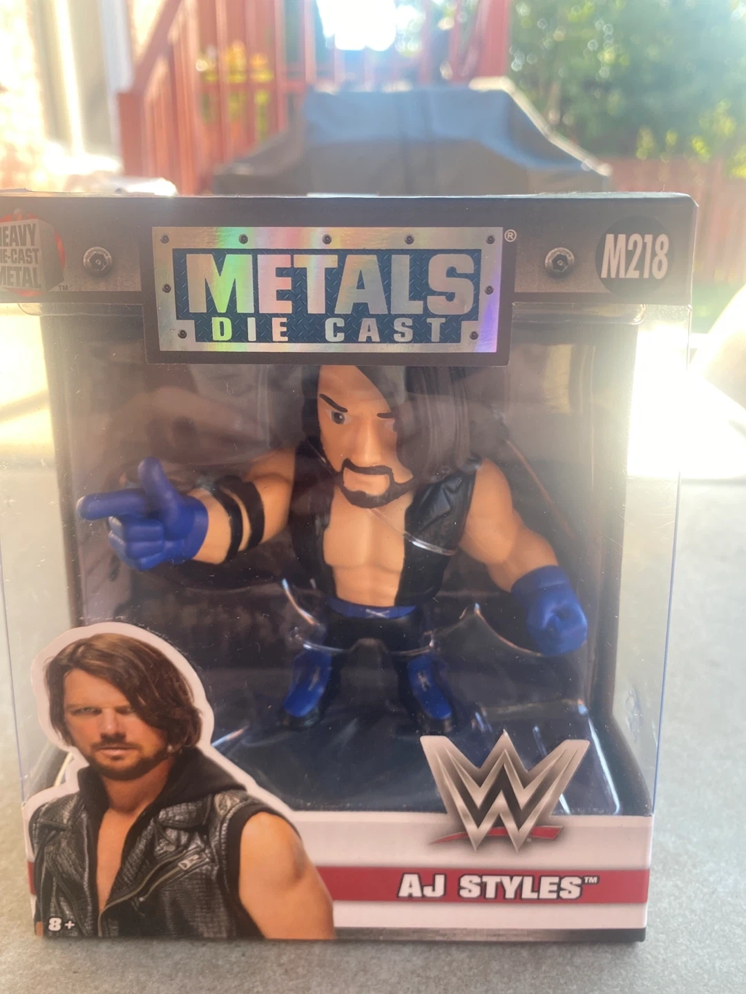 Selling a WWE AJ Styles Metals Die Cast figure, model M218. It's still in its original packaging and appears to be in excellent condition!