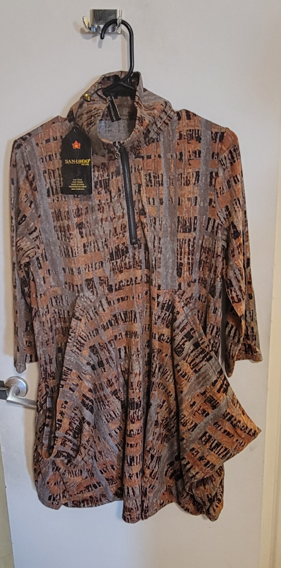 Here's a San Lodo tunic top with a unique brown pattern! It features a quarter-zip neckline and interesting pocket detailing. Perfect for adding a bit of flair to your wardrobe