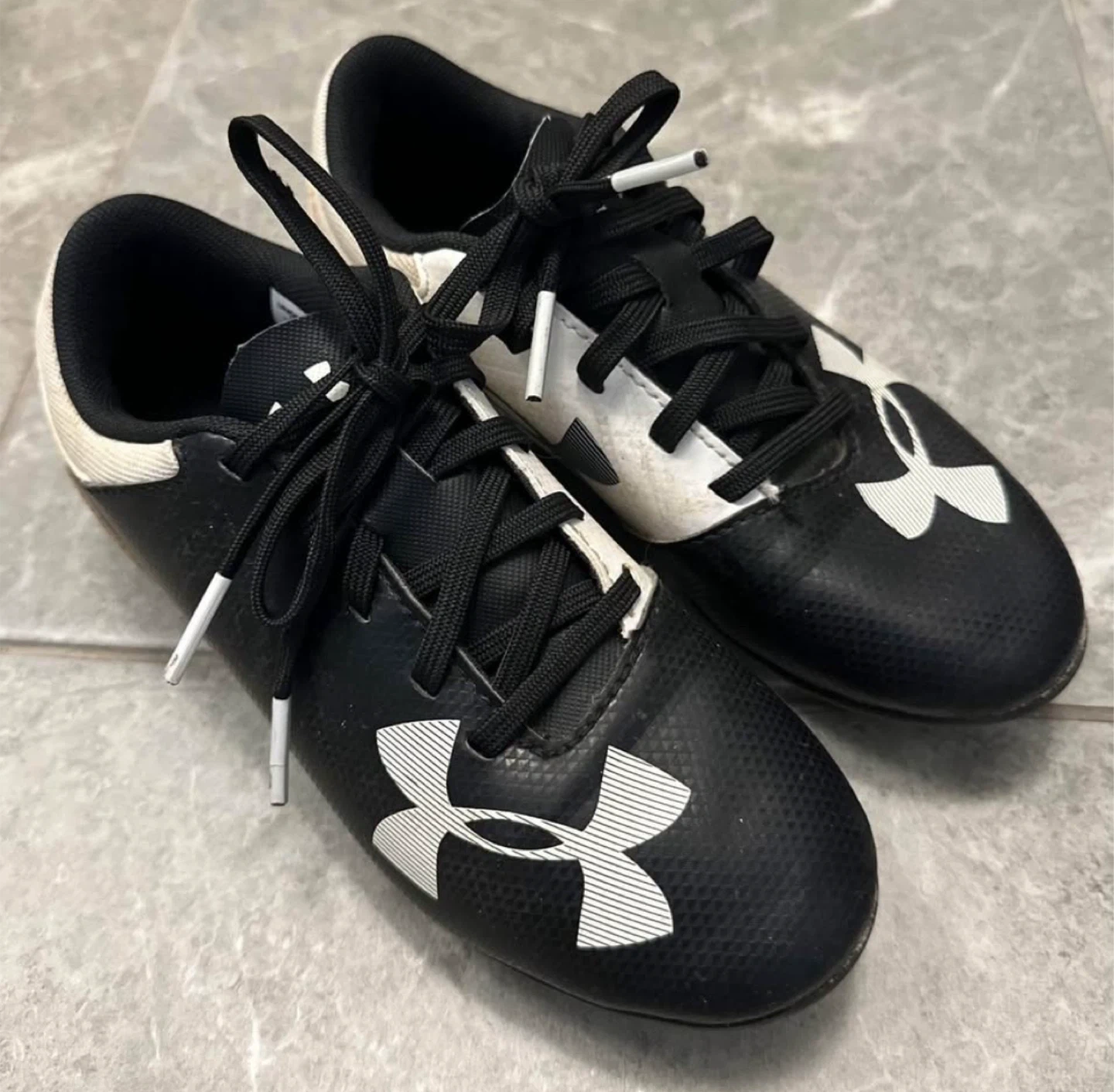 Selling a pair of Under Armour kids' soccer cleats in size 13K. They're black and white and have the Under Armour logo on the side. Also including Nike Charge shin guards for extra protection on the field.