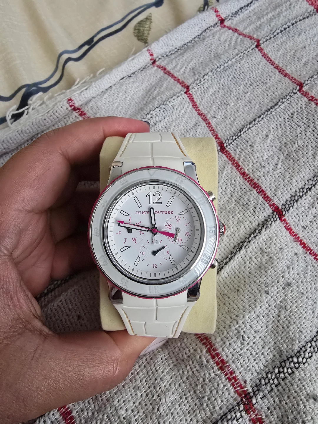 Selling a Juicy Couture watch with a white band and face! It has a stylish design with chronograph details. Perfect for adding a touch of glam to your everyday look. In great condition overall — just has some light discoloration from storage and needs a new battery since it hasn’t been used for a while.