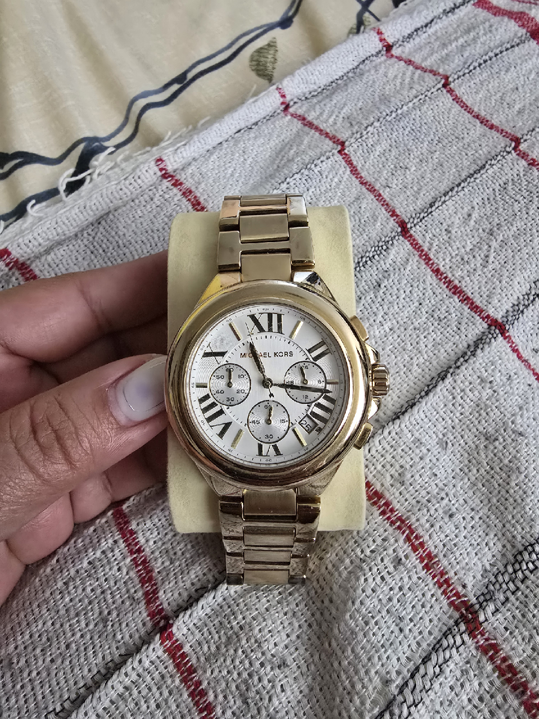 Selling a Michael Kors women's watch in gold tone. It's in good condition and ready for a new owner! It needs a battery since I haven’t used it for a while now.