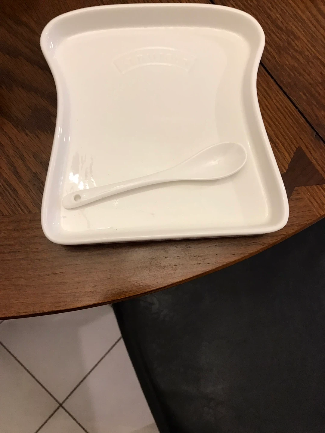 1000+New white ceramic tray that comes with a matching spoon, perfect for serving small snacks or condiments. 6βx7β.