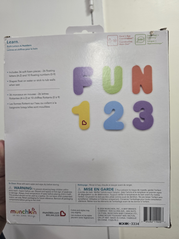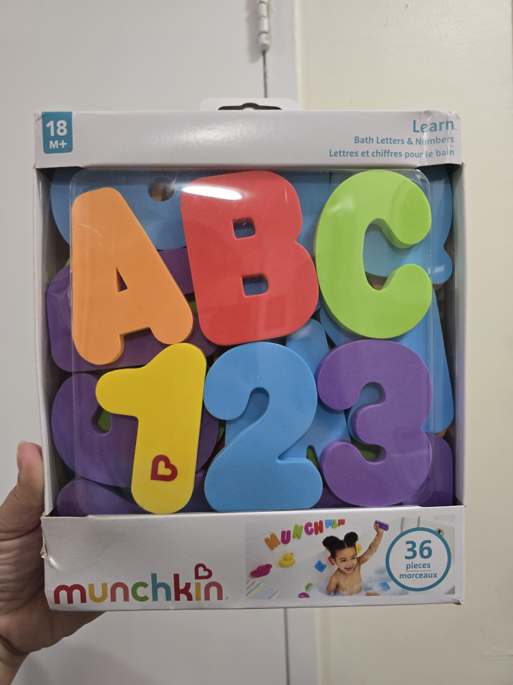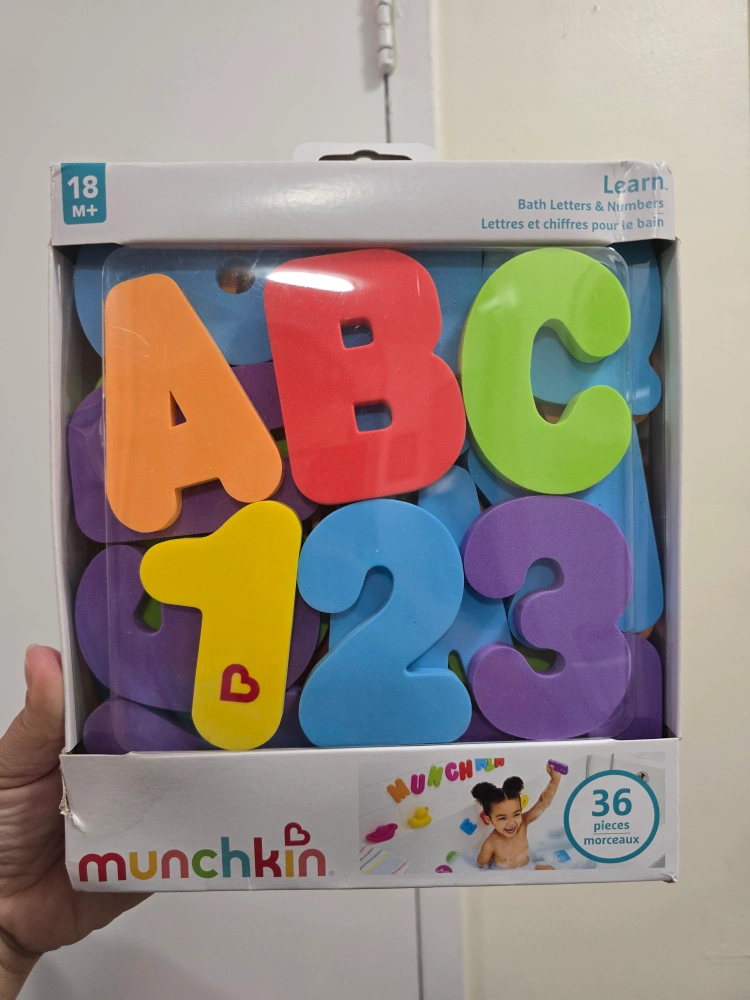 I'm selling a brand new set of Munchkin Bath Letters & Numbers! This set includes 36 soft foam pieces, with 26 floating letters (A-Z) and 10 floating numbers (0-9). The shapes float on water or stick to tub walls when wet. Recommended for ages 18 months and up