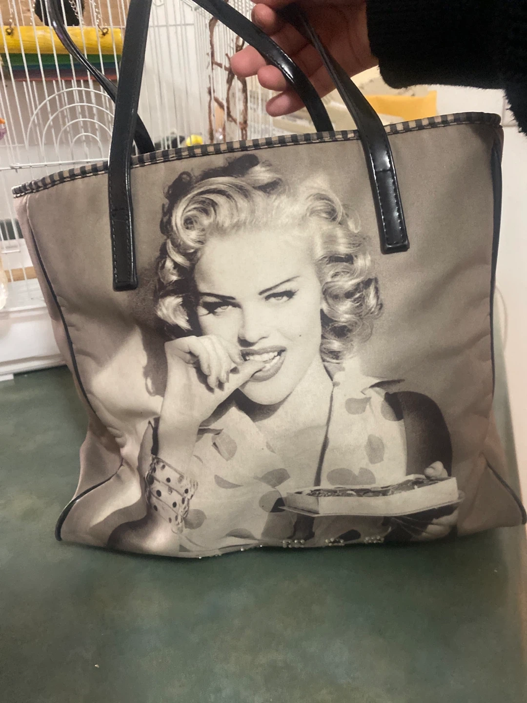 I'm selling a tote bag. It has a picture of a woman on it and black handles