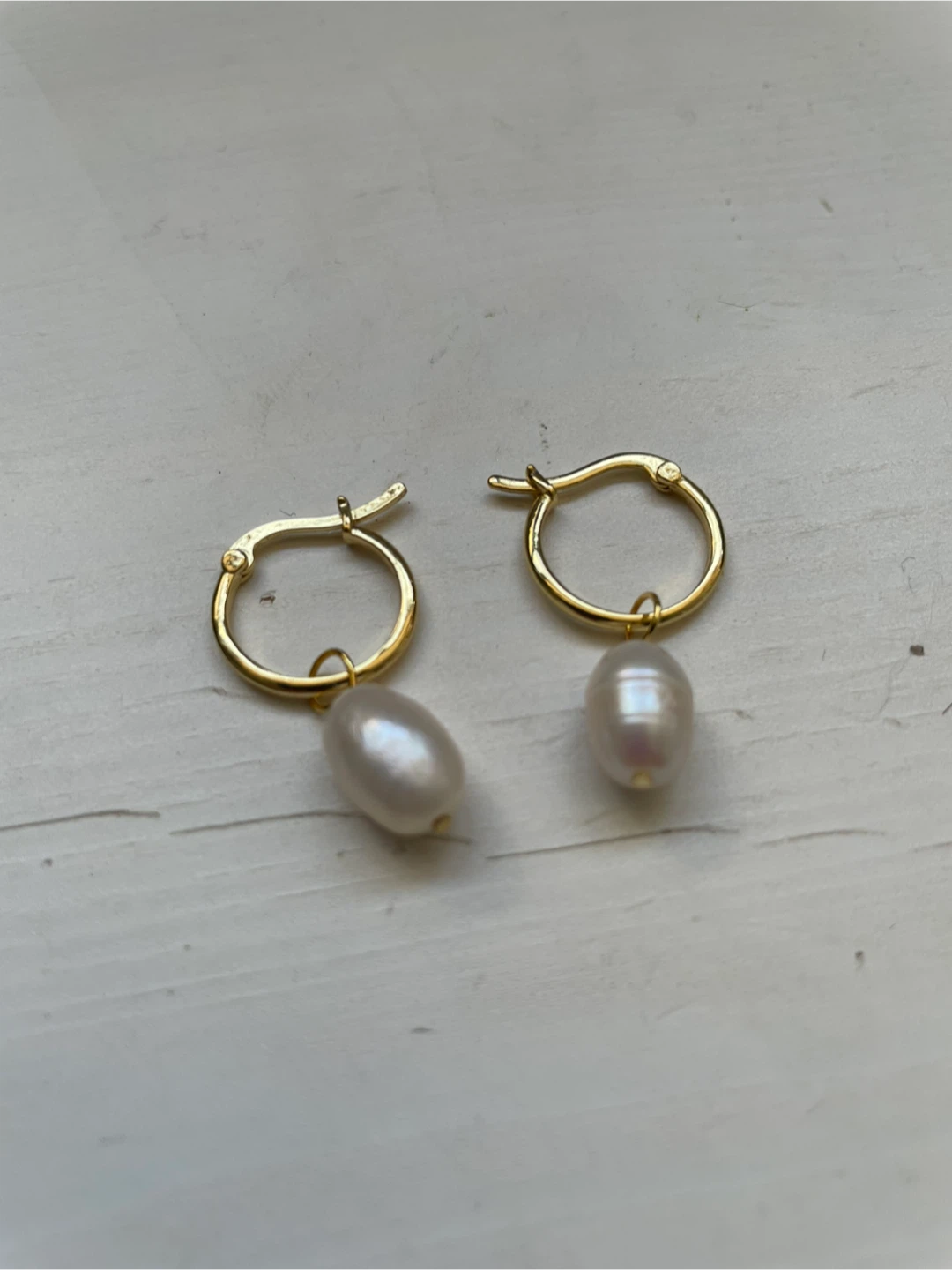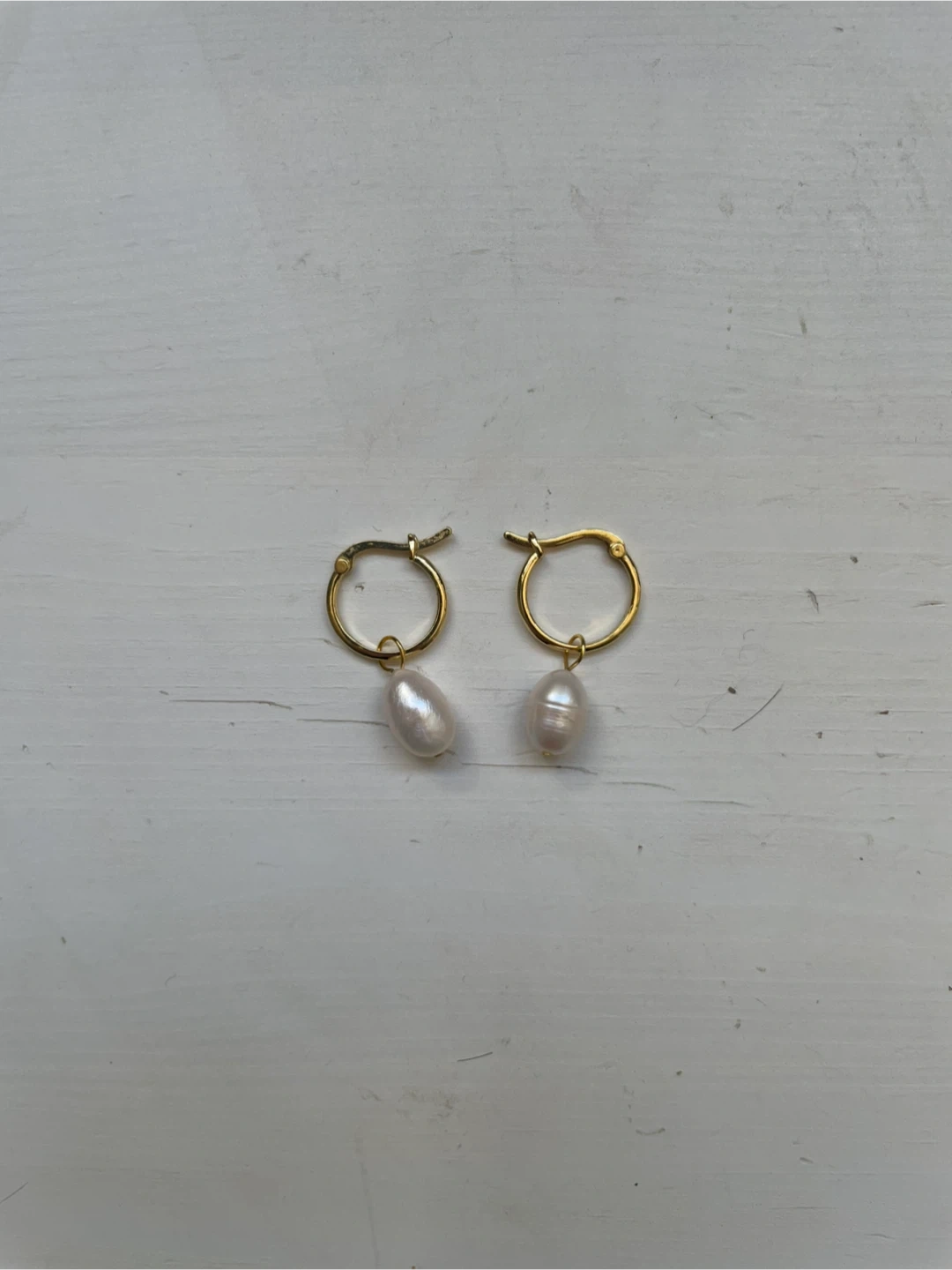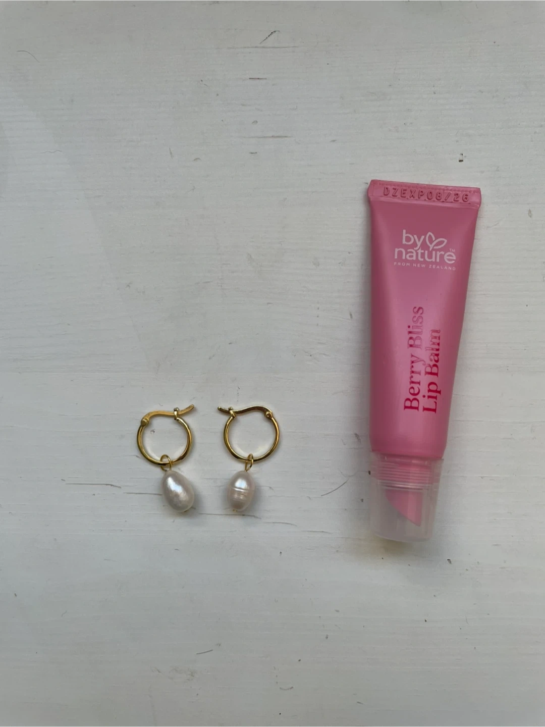Selling a pair of Evry Jewels pearl drop earrings. Gold plated and approximately half an inch hoop in diameter. Lip balm for scale.