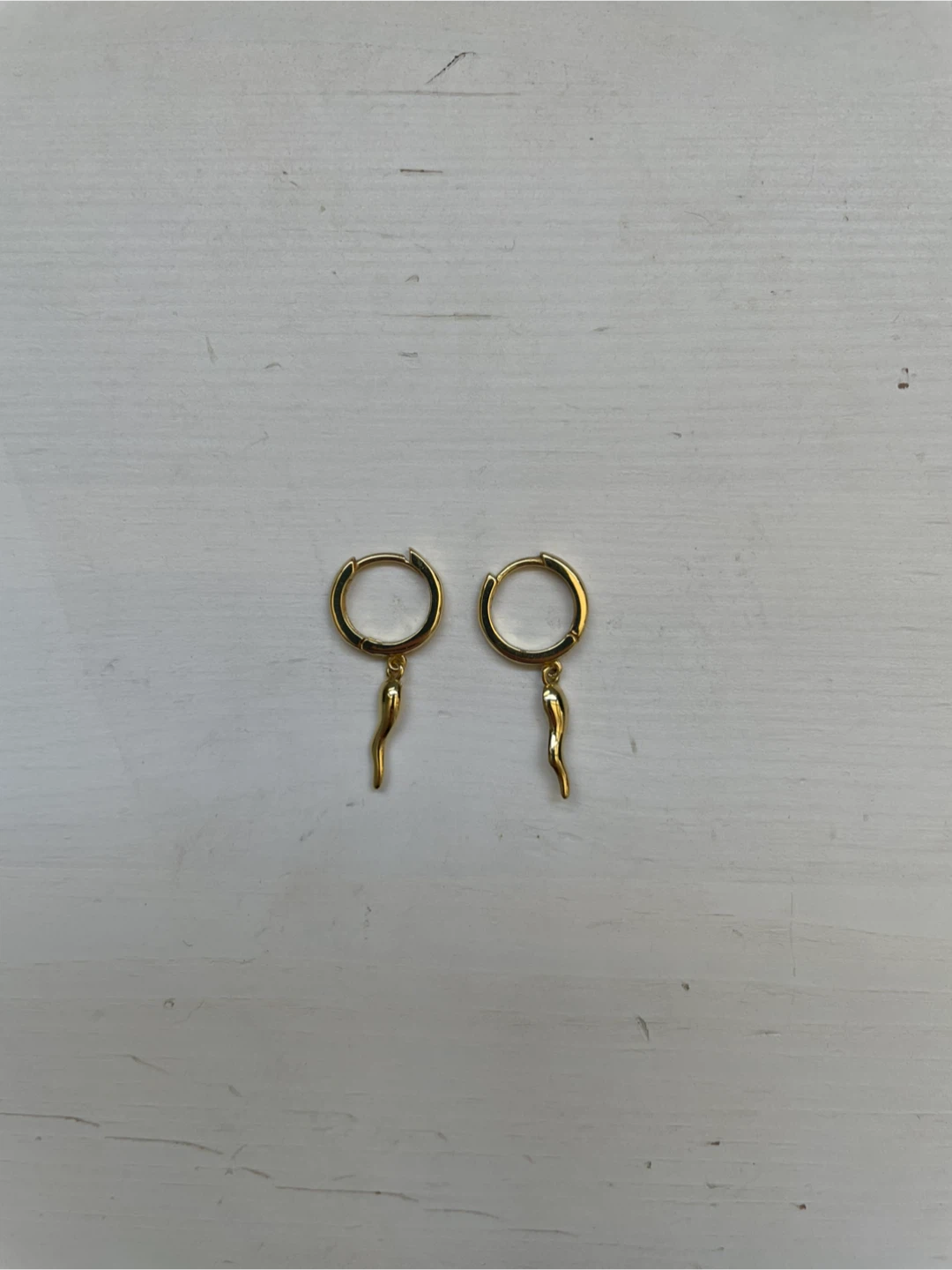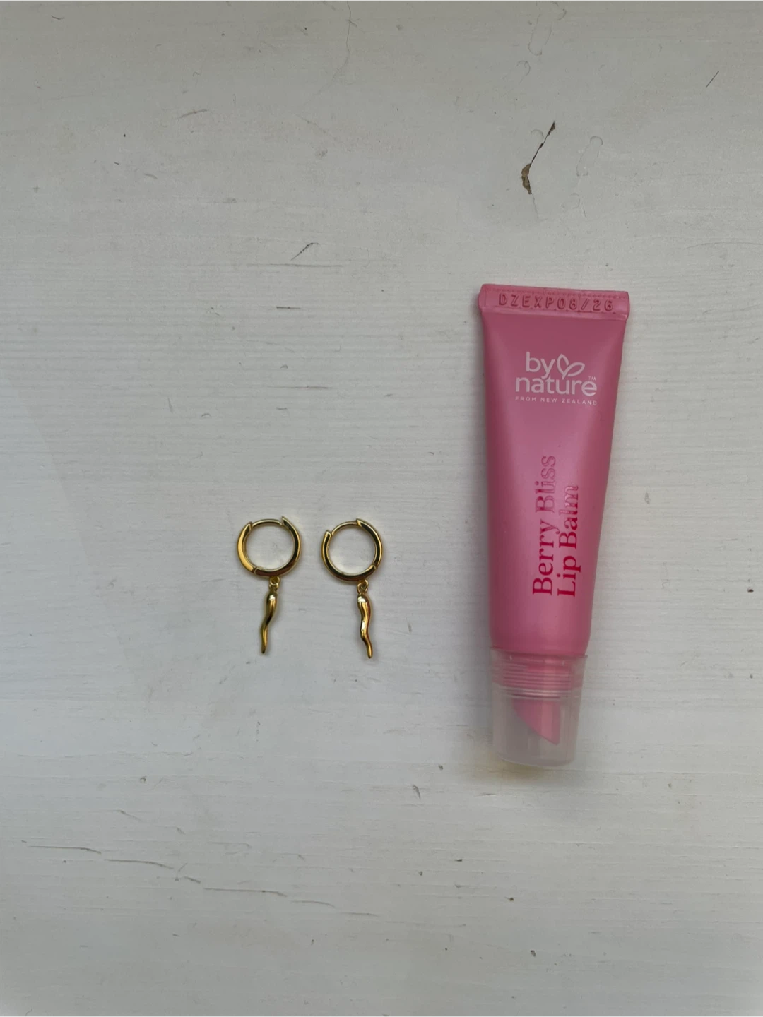 Selling a pair of The Perfect Hoop drop earrings. Gold plated and approximately half an inch hoop in diameter. Lip balm for scale.