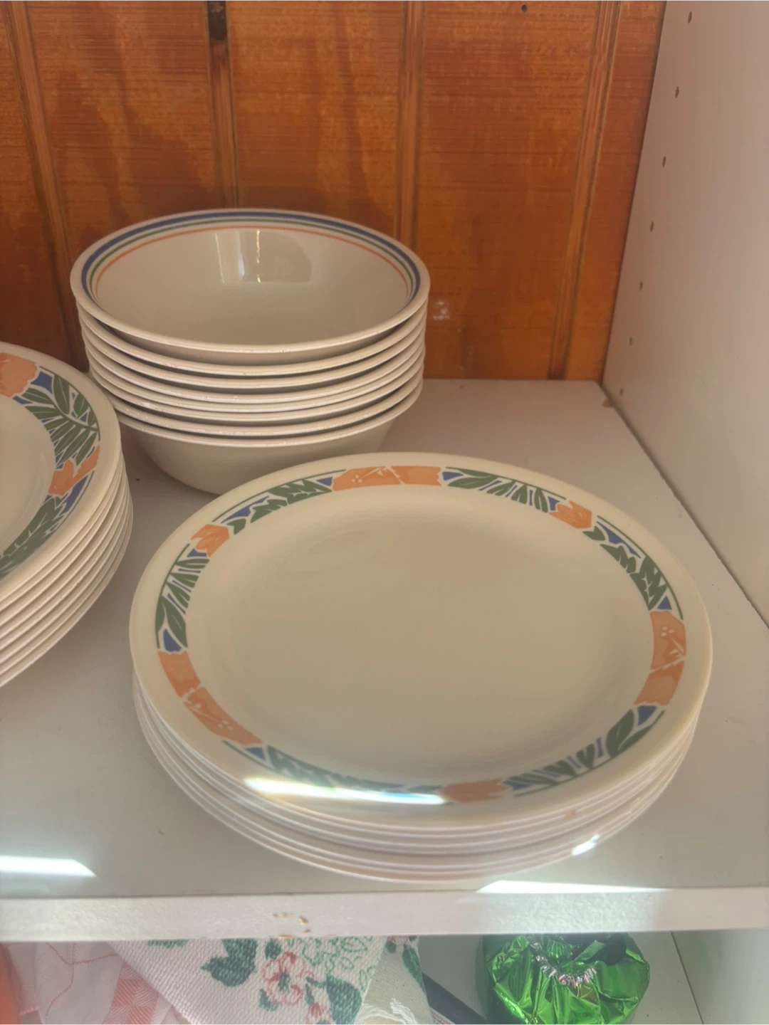 Selling a set of 8 dishes that includes plates and bowls. They have a floral design around the edges with orange, green, and blue colors. These are perfect for everyday use or for special occasions. With corelle coffee cups