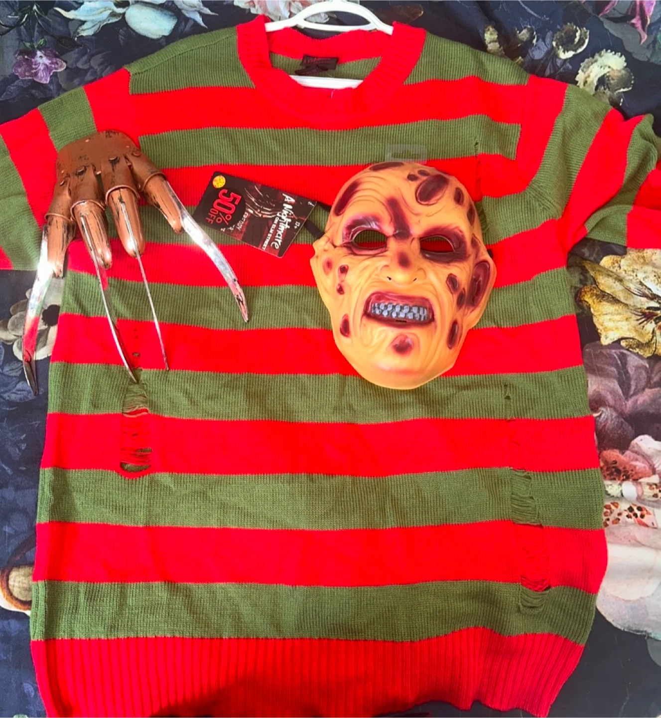 Get ready for Halloween with this Freddy Krueger costume! It includes the iconic striped sweater, mask, and glove with blades. The sweater is a size Men’s XL. Mask has never been worn.