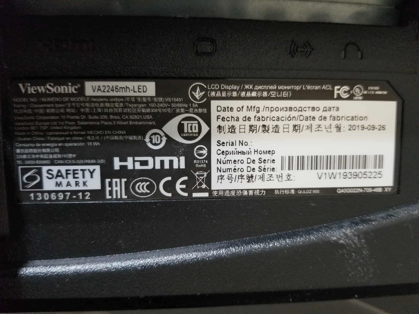 Selling a ViewSonic VA2246mh-LED monitor in good condition. It's a reliable monitor that's perfect for everyday use. The model number is VS15451. Manufacturing date is 2019 September 26.