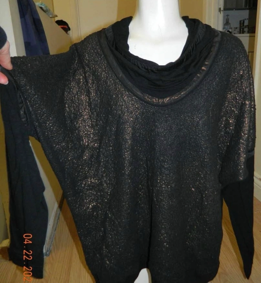 Stylish black top with a unique textured pattern and cowl neckline. It has long sleeves and a comfortable fit. Perfect for adding a touch of edgy elegance to your wardrobe!