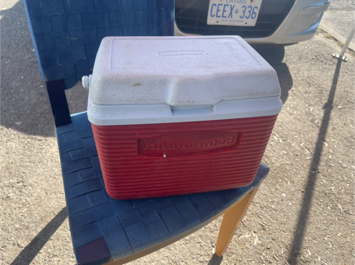 Selling a Rubbermaid cooler, perfect for picnics, camping, or keeping your drinks cold on a hot day! It's red and white and ready for its next adventure
