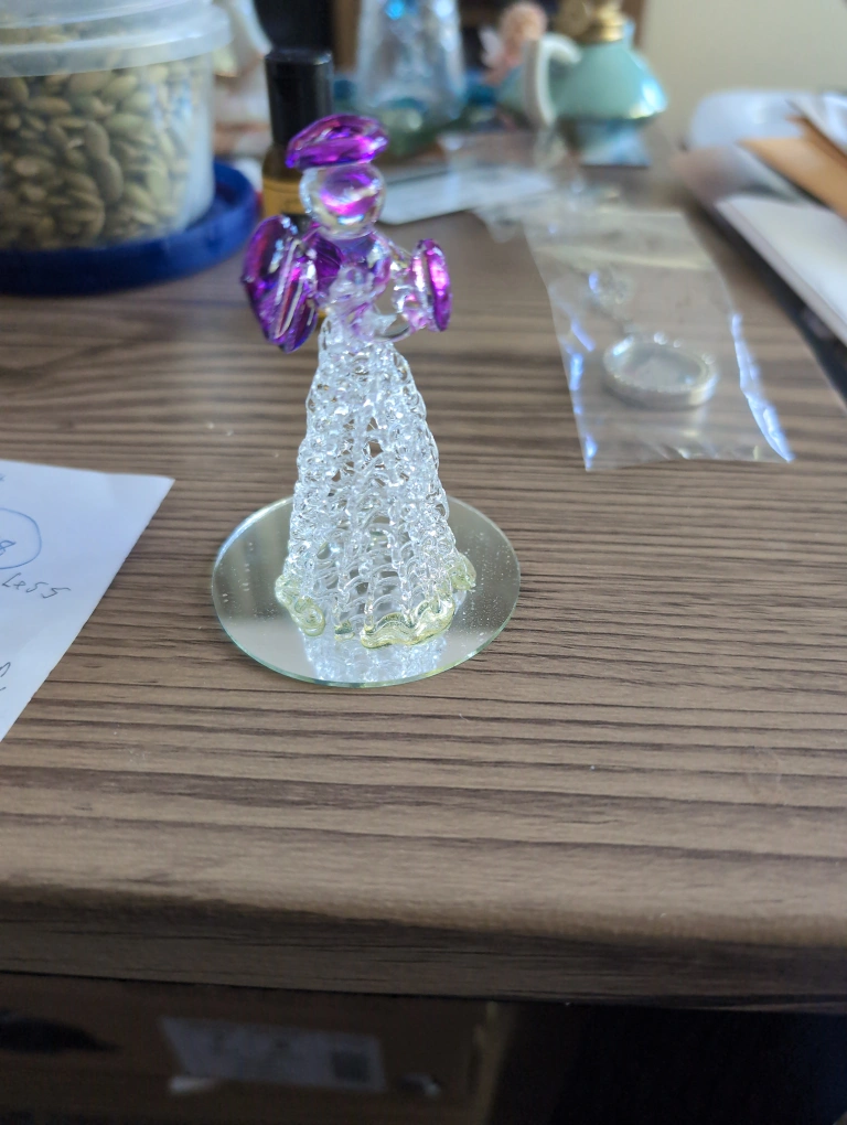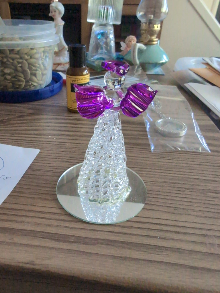 A lovely glass angel figurine with vibrant purple wings and a heart. It's in great condition and would make a charming addition to any collection or a sweet little gift. Perfect gift for that special February person in you life