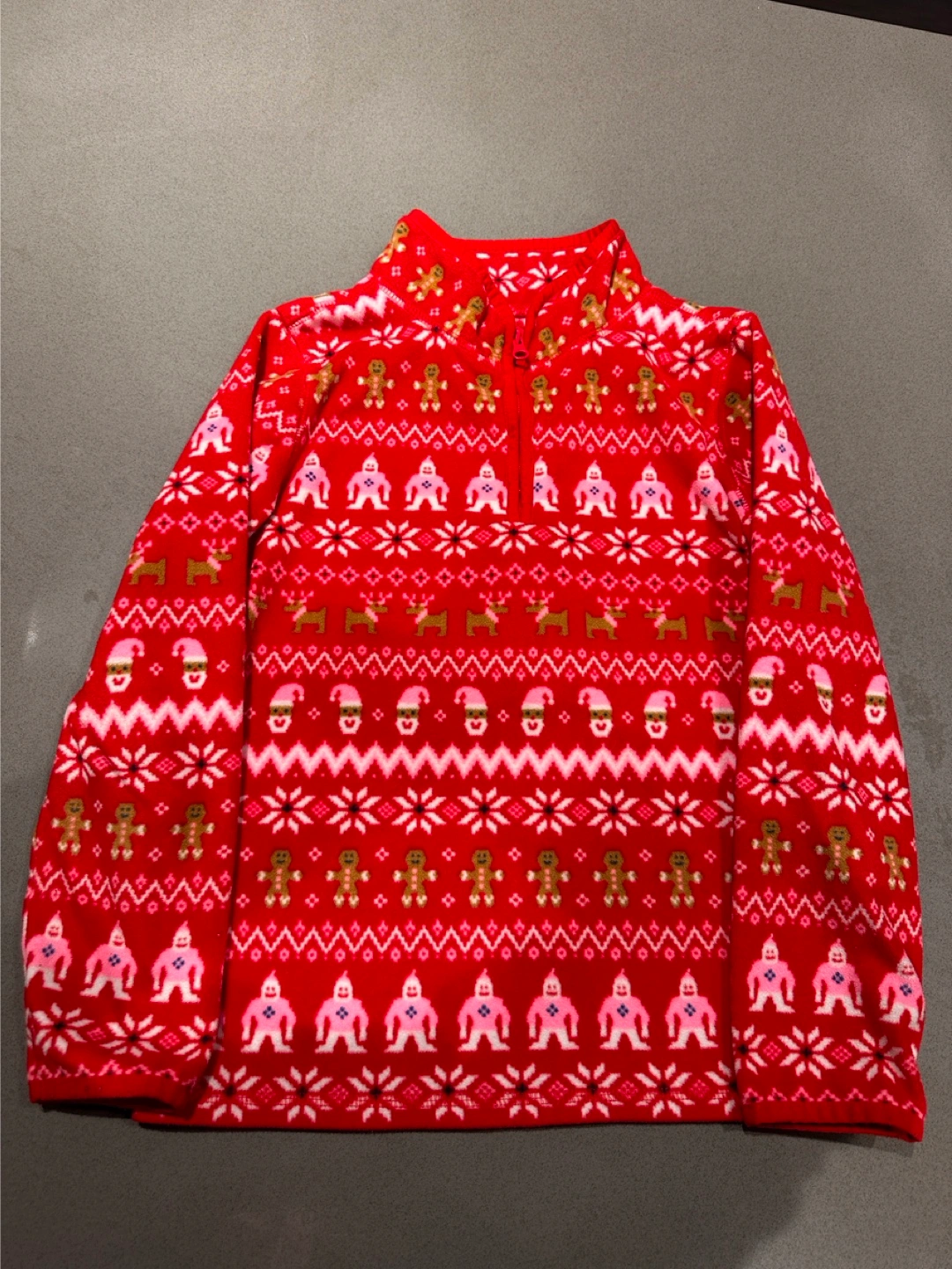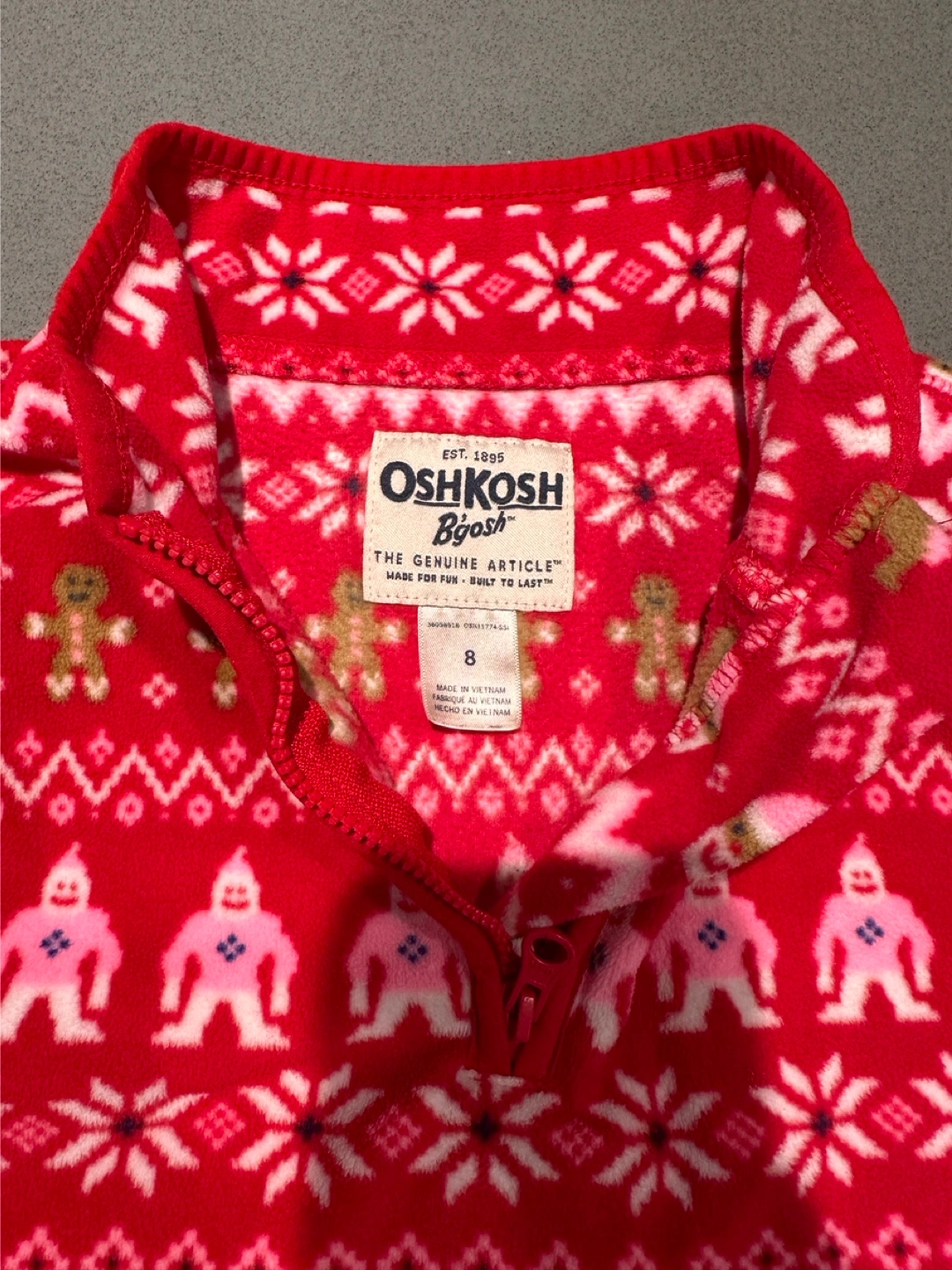 Cozy OshKosh B'gosh Christmas-themed fleece pullover in size 8! It features a fun and festive pattern with gingerbread men, snowflakes, and other holiday designs on a vibrant red background. Perfect for keeping your little one warm and stylish during the holiday season