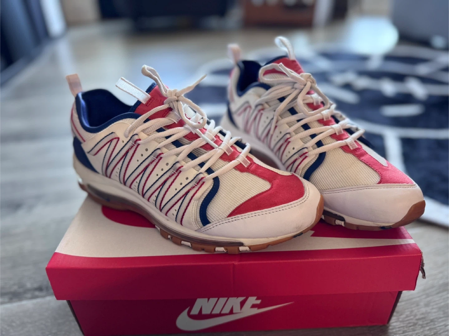 10Selling a pair of Nike Air Max 97 sneakers in a red and white colourway. They come with the original box. Great for adding a pop of colour to your outfit!