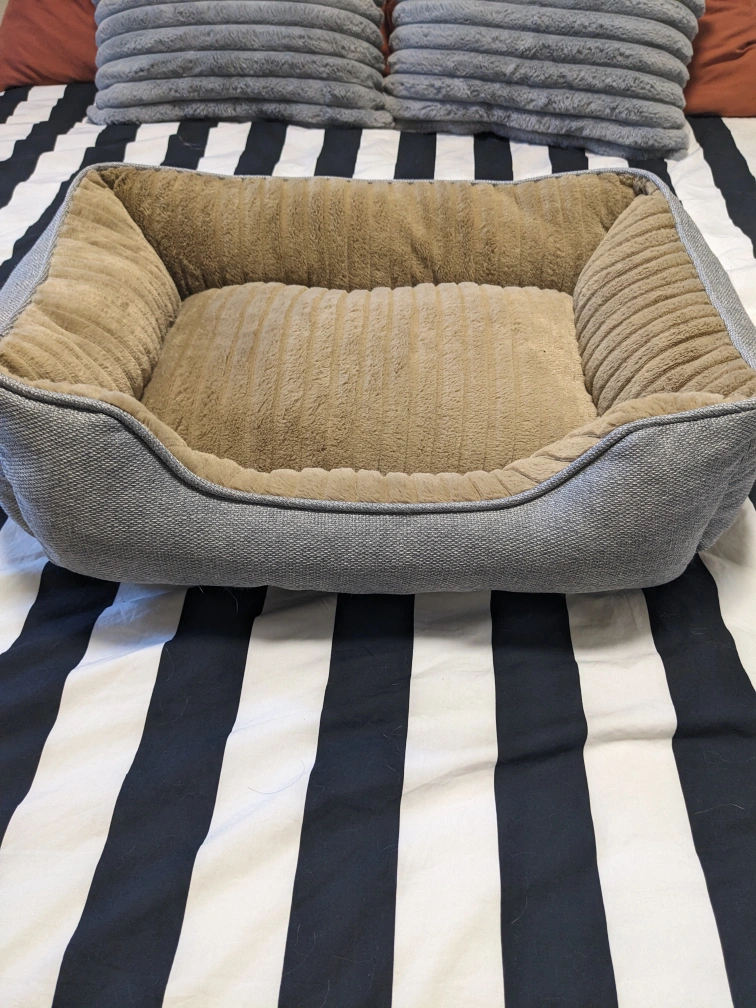 Offering a comfy pet bed with a soft, plush interior and a durable gray exterior. Perfect for small dogs or small medium-sized cats. My boy is too plump for this, so it has never been used.