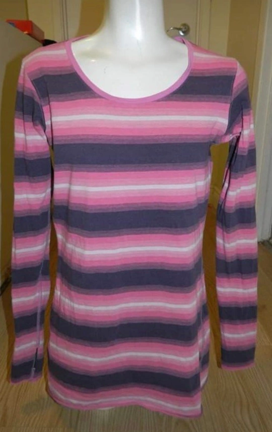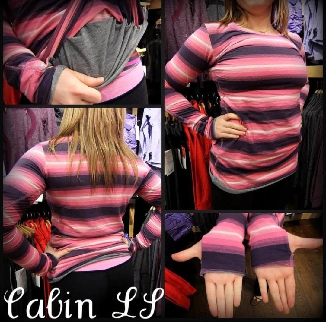 Here's a Cabin LS long sleeve top with a cute striped pattern! The colours are in shades of pink, purple, and white. It also has a thumb hole detail on the sleeves. Perfect for layering or wearing on its own