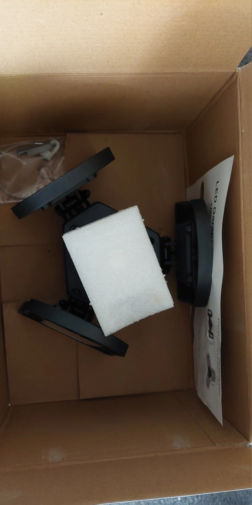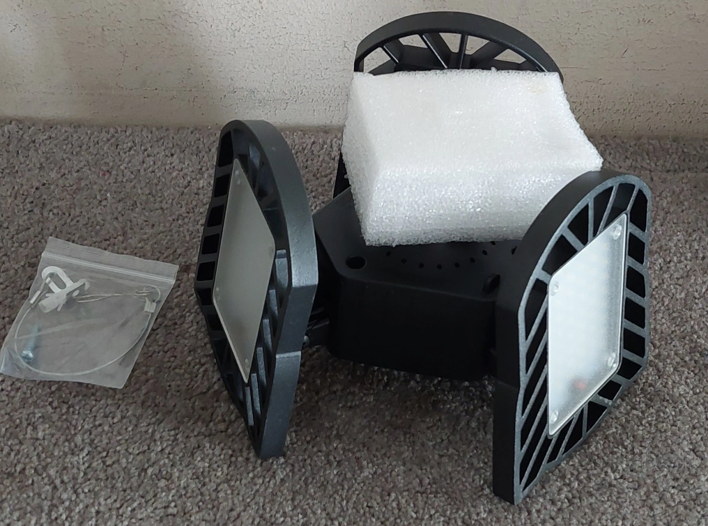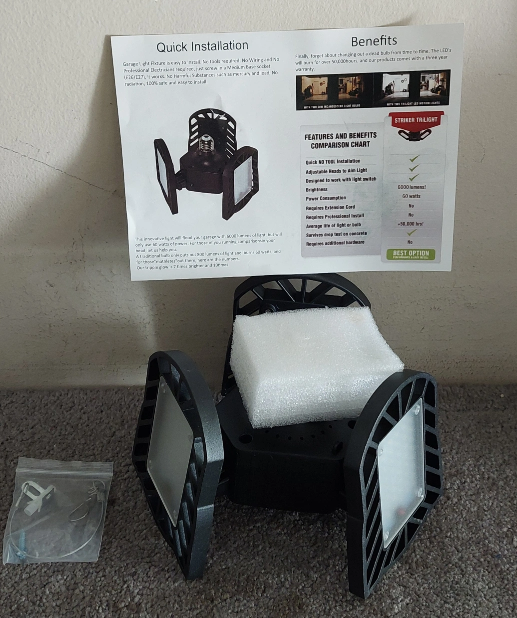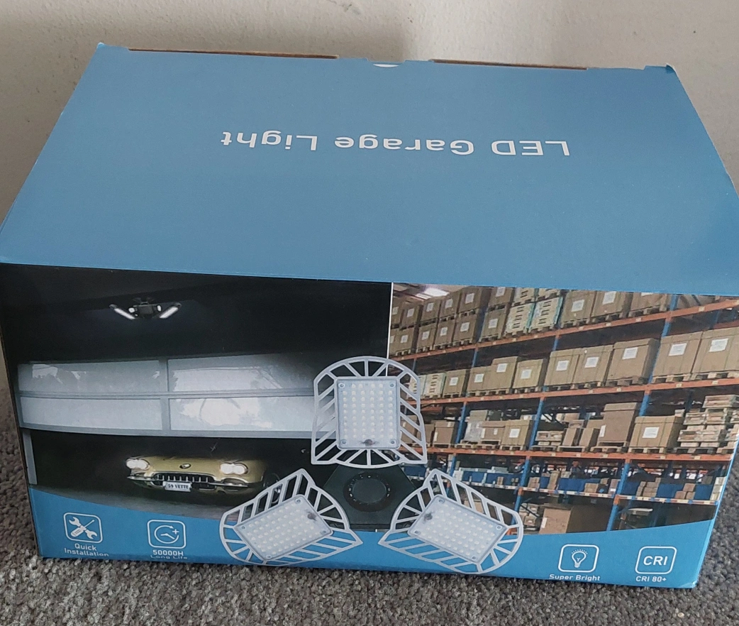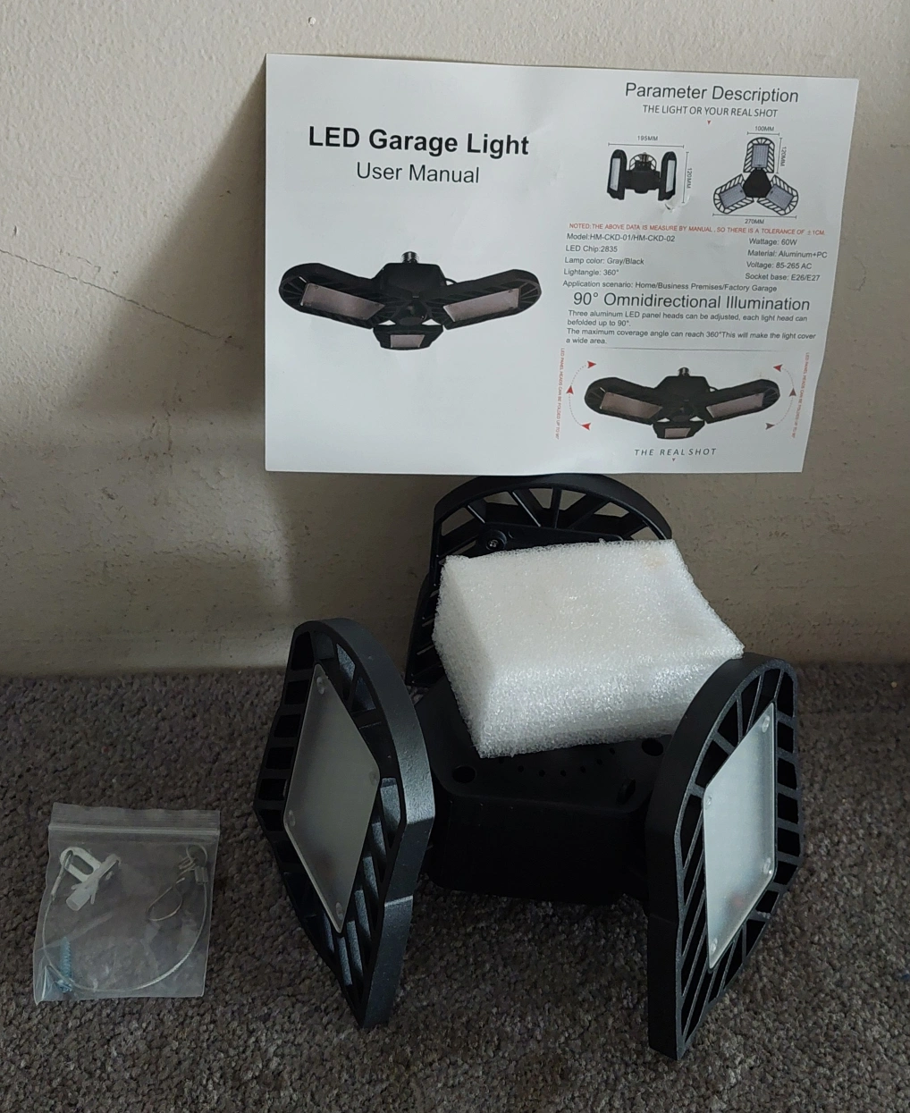 Selling an LED Garage Light, model HM-CKD-01 in Gray. It's in great condition and comes with the user manual. It has 90° Omnidirectional illumination, making the light cover reach 360°! The wattage is 60W and the voltage is 85-265 AC. Perfect for your garage or workshop