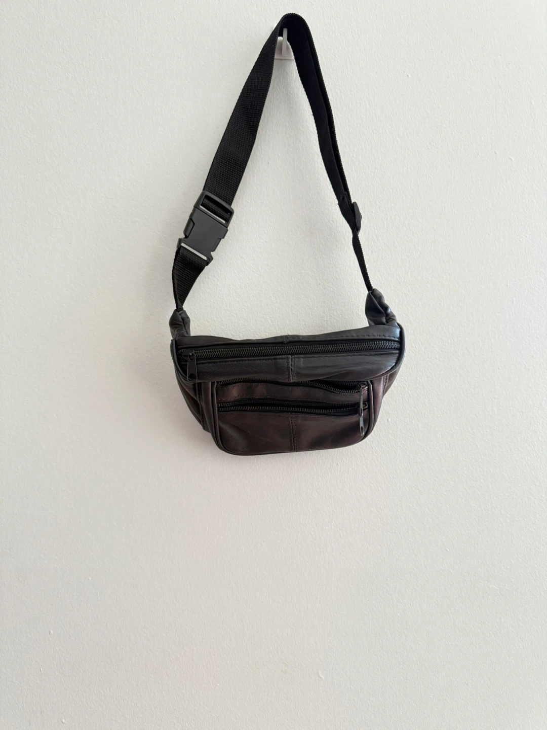 Selling a black leather belt bag! It's in great condition and perfect for carrying your essentials. The adjustable strap makes it easy to wear around your waist or across your body. Has multiple zippers for easy access and storage