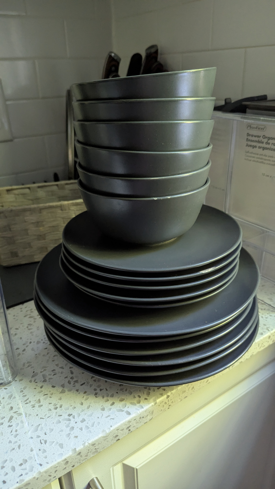 Selling a set of dark grey dinnerware. Includes plates and bowls. There are some signs of use, as shown in the photos. Great for everyday use!