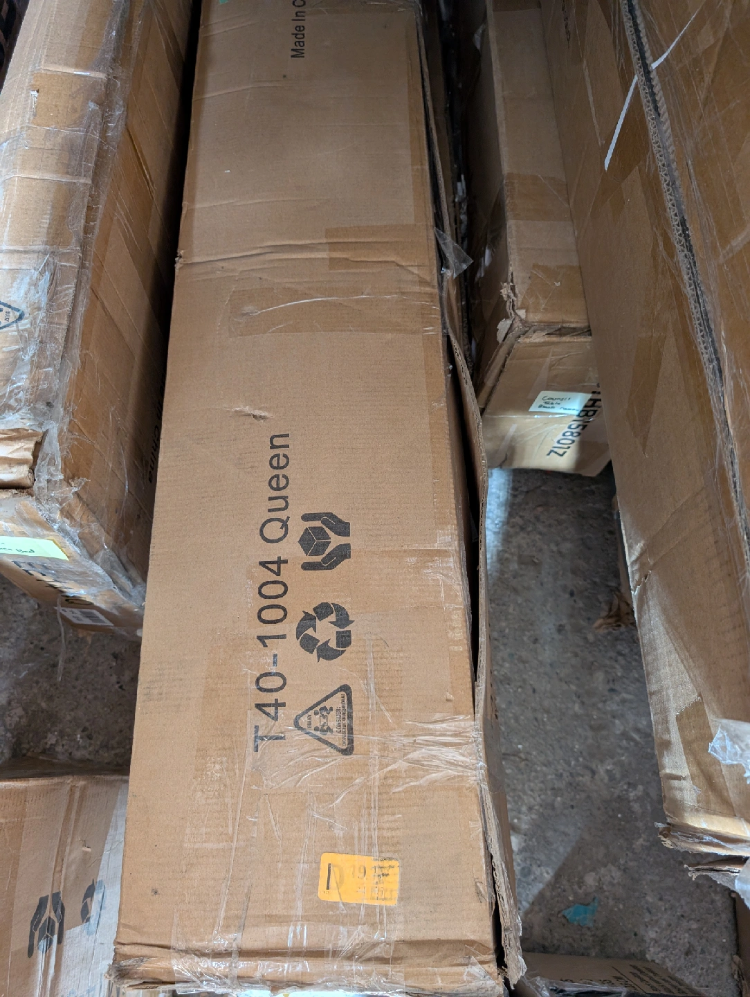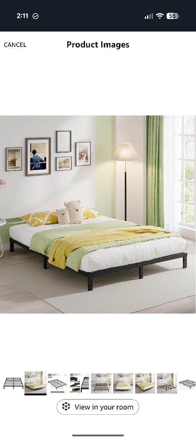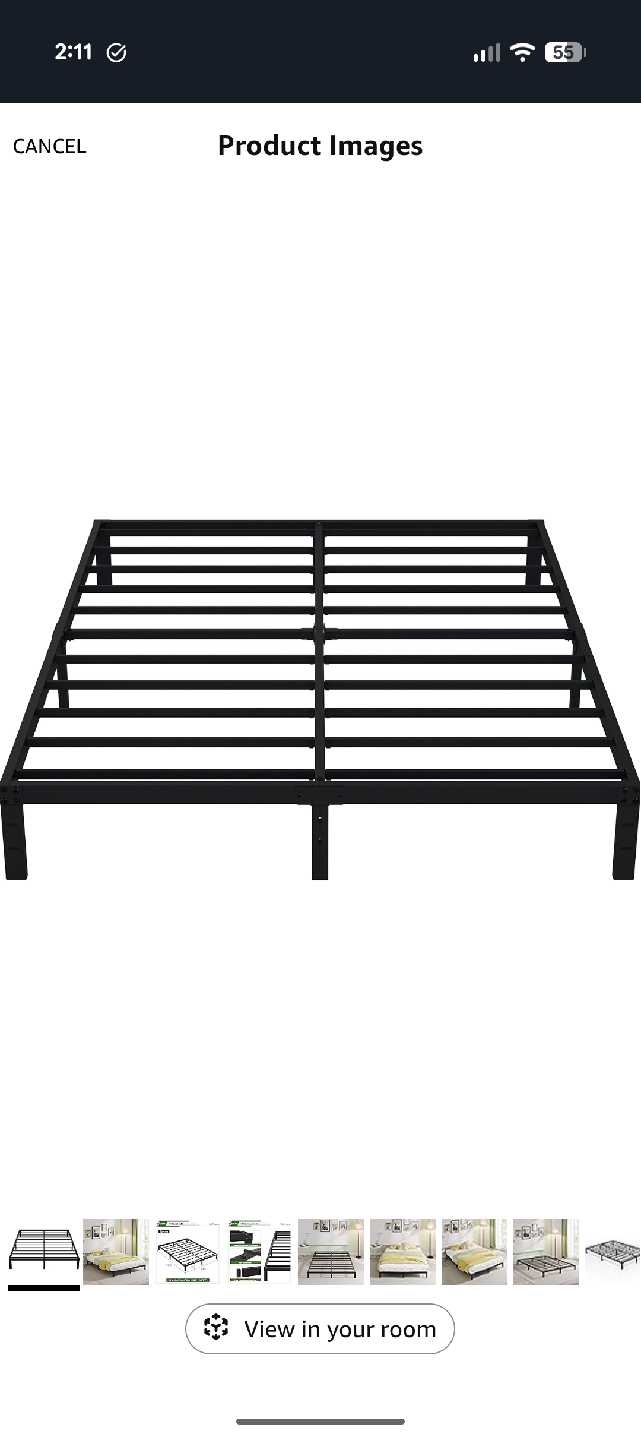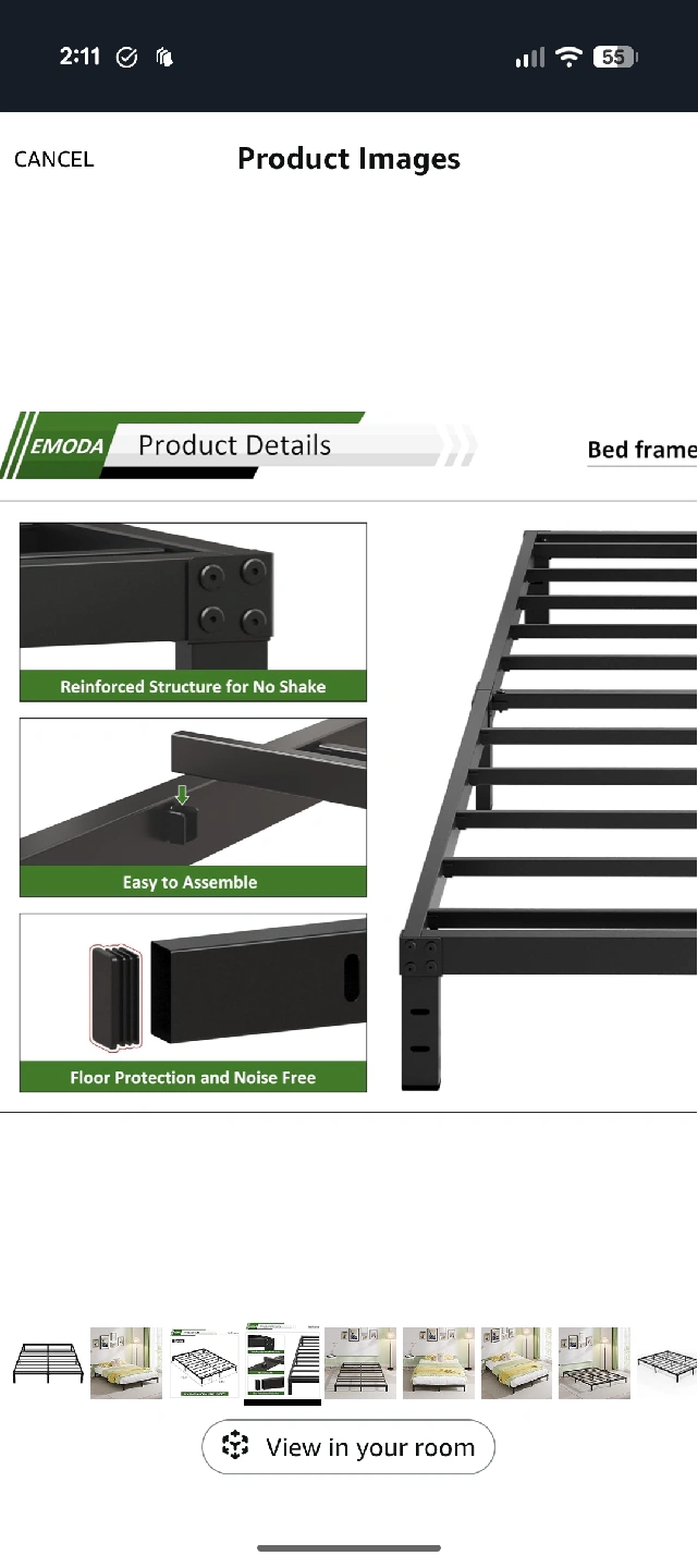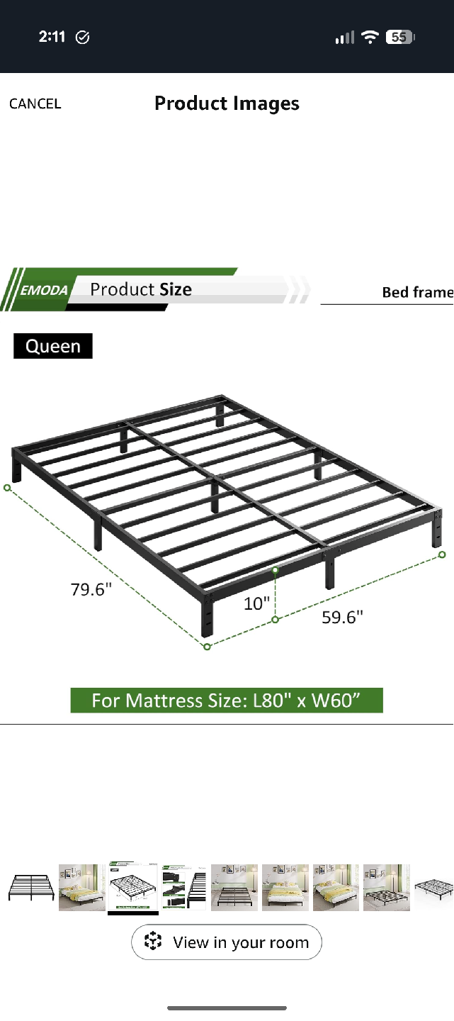 Selling a queen size bed frame by EMODA. It's a metal platform bed frame that's easy to assemble and provides floor protection. The reinforced structure ensures no shaking. Dimensions are approximately 79.6" x 59.6".