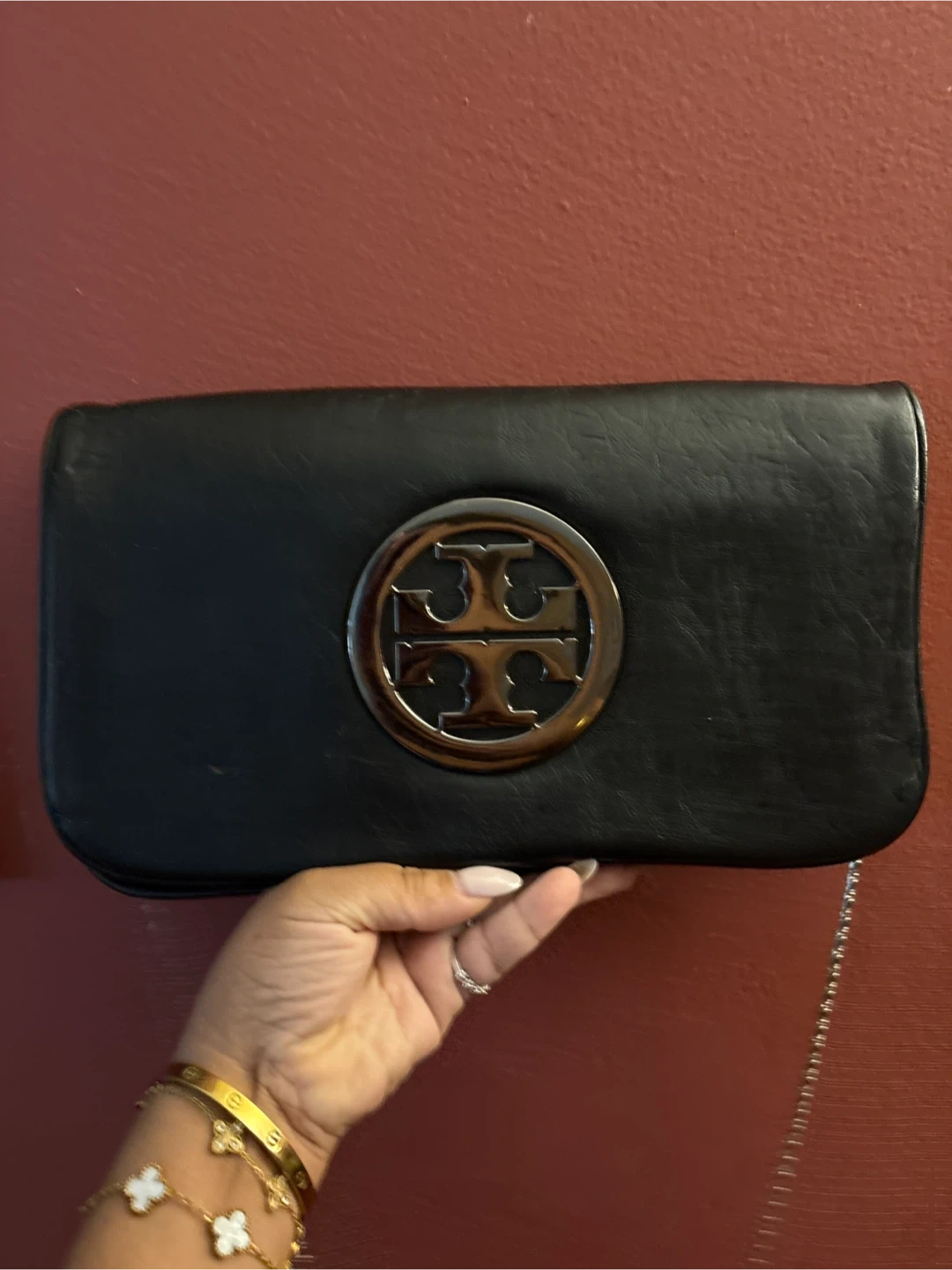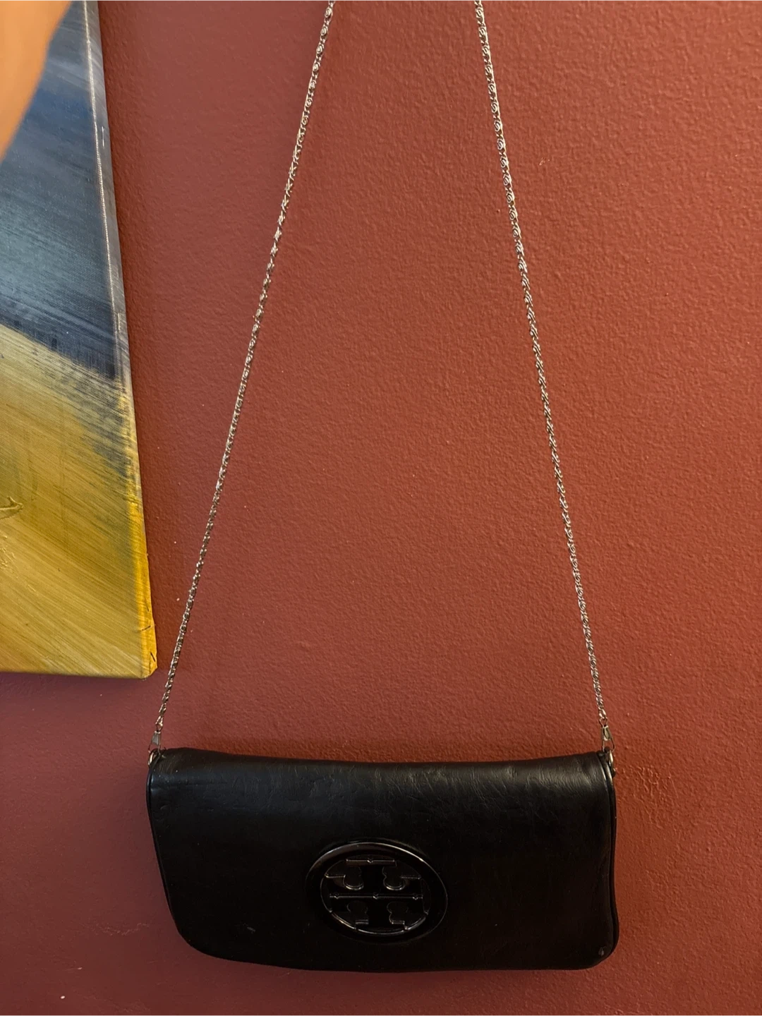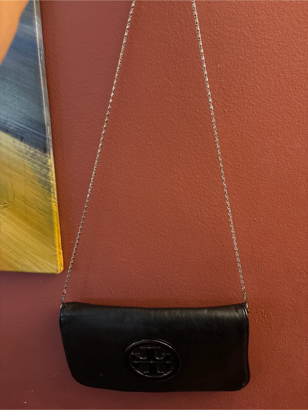 Selling a Tory Burch black bag with a chain strap. It's in good condition and perfect for a night out or everyday use! The bag features the classic Tory Burch logo. The interior has a zipper and slip pocket.