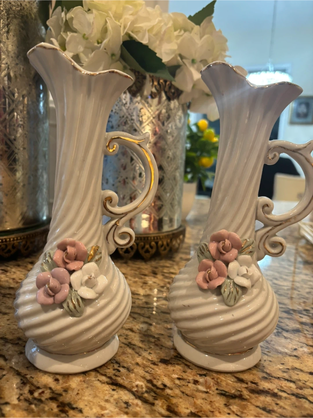 10Selling a pair of lovely decorative vases! They have a unique spiral design with delicate floral accents in shades of pink and white. The handles are accented with gold, adding a touch of elegance. Perfect for adding a touch of charm to any room