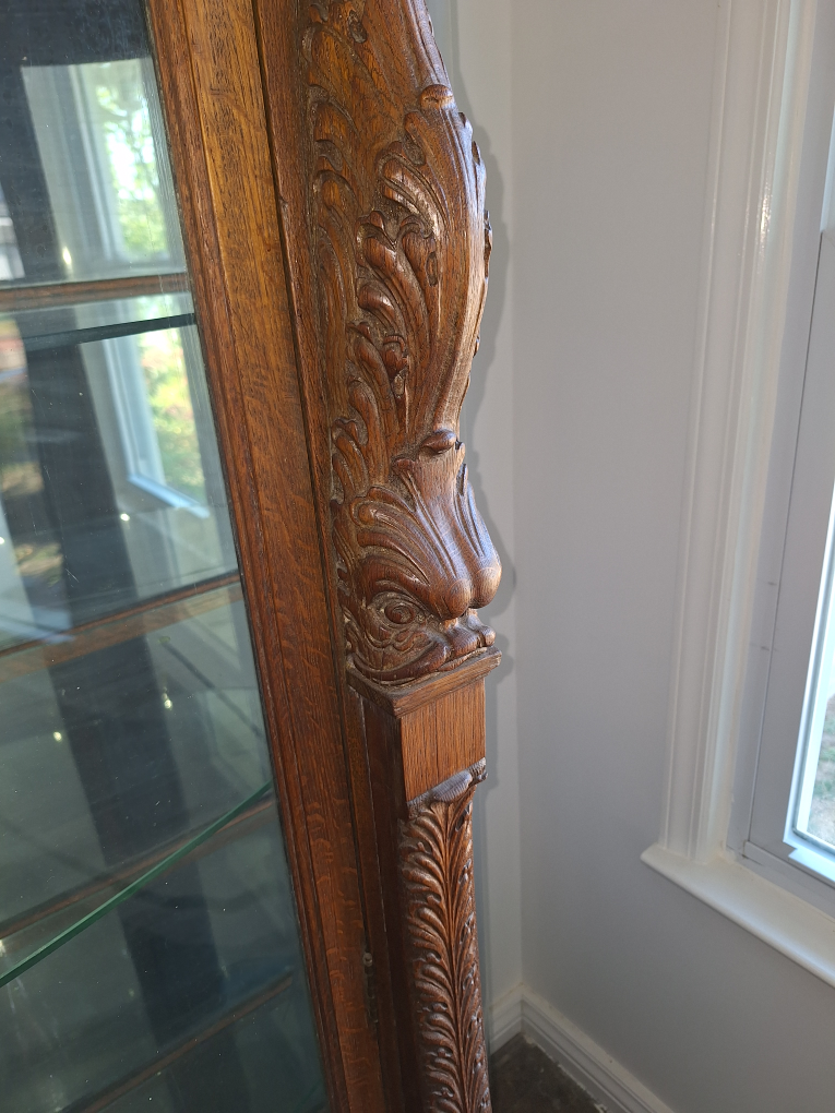 Beautiful antique curved glass display cabinet. It features ornate wood carvings and glass shelves. Perfect for displaying collectibles or adding a touch of elegance to any room.