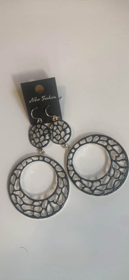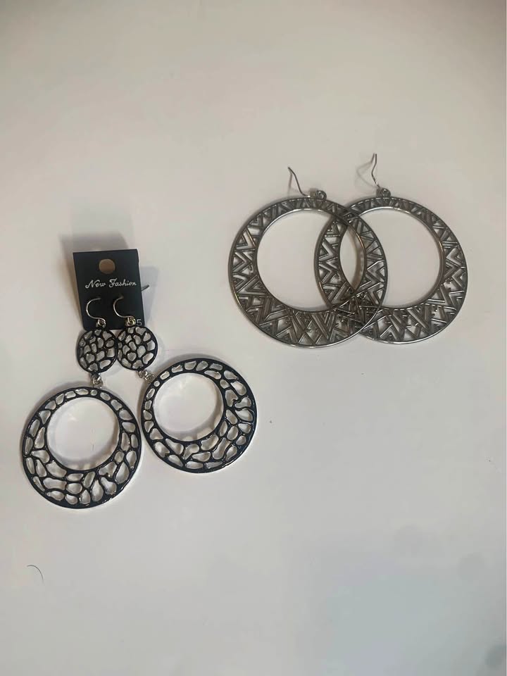 One pair features a double circle design, while the other is a single large circle with a geometric pattern. One in black and one in silver tone. Both are perfect for adding a stylish touch to any outfit