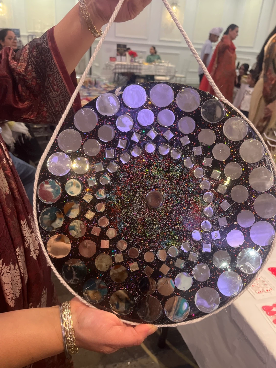 This is a beautiful decorative mirror mandala wall art piece. It features a circular design with various sizes and shapes of mirrors embedded in a dark, glittery background. The edges are finished with a rope detail. It's a unique piece that would add a touch of sparkle to any room