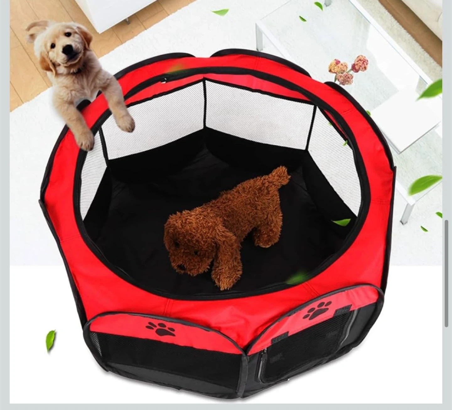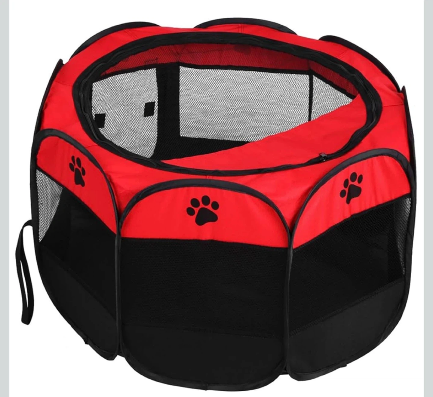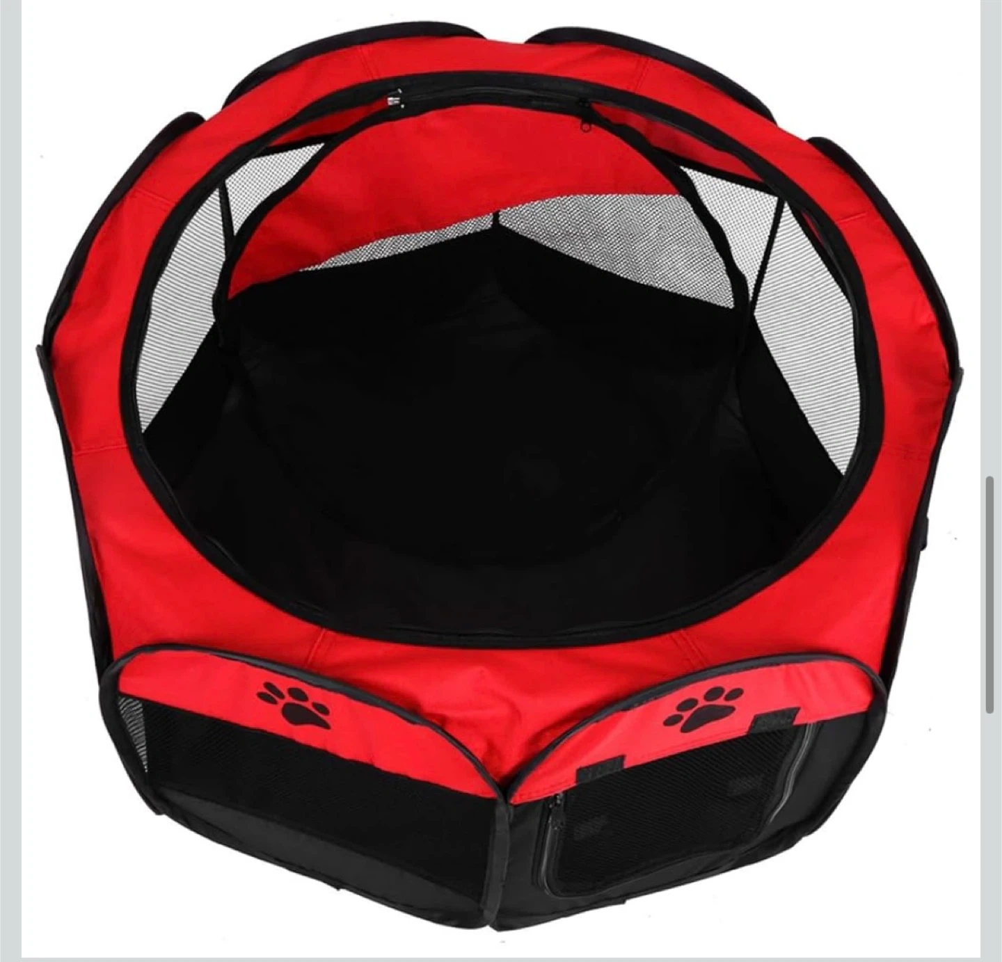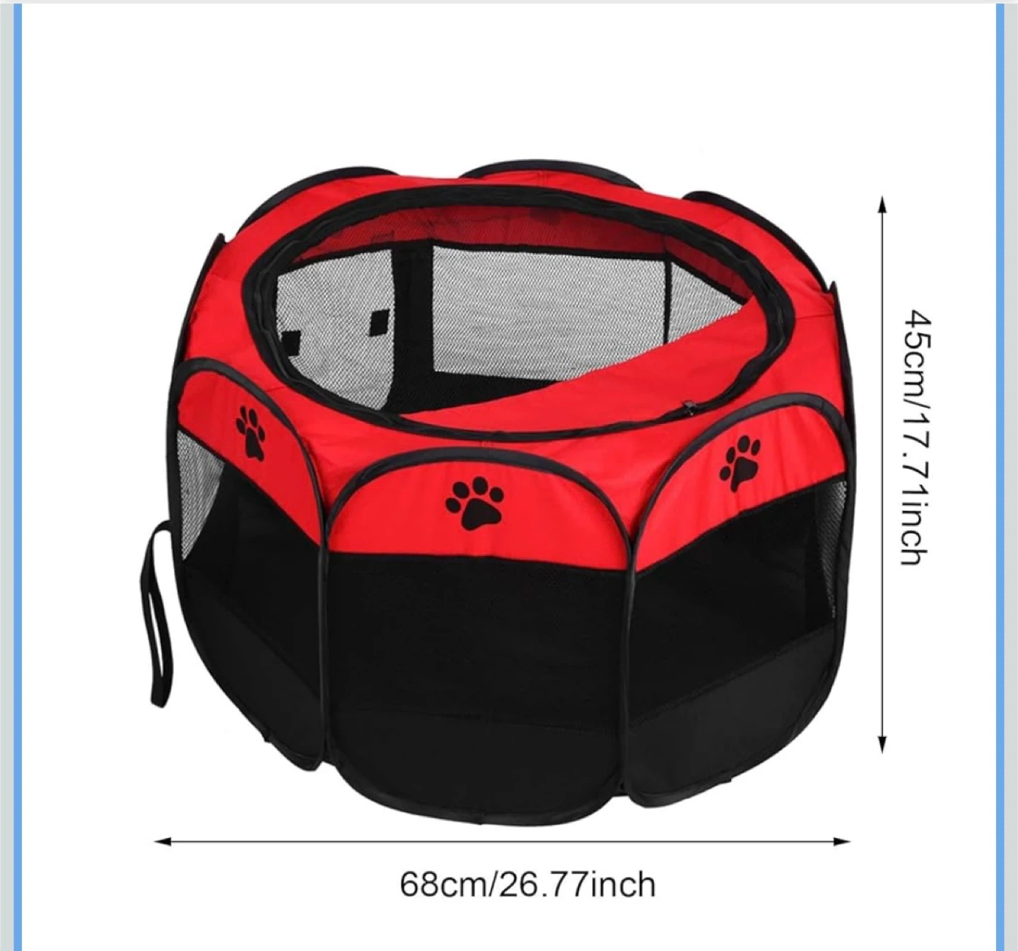 Selling a red and black pet playpen! It's in great condition and perfect for keeping your furry friend safe and secure, whether you're indoors or out. The playpen is lightweight and portable, making it easy to take with you on trips or to the park. Dimensions: - 45cm/17.71 inches tall - 68cm/26.77 inches wide