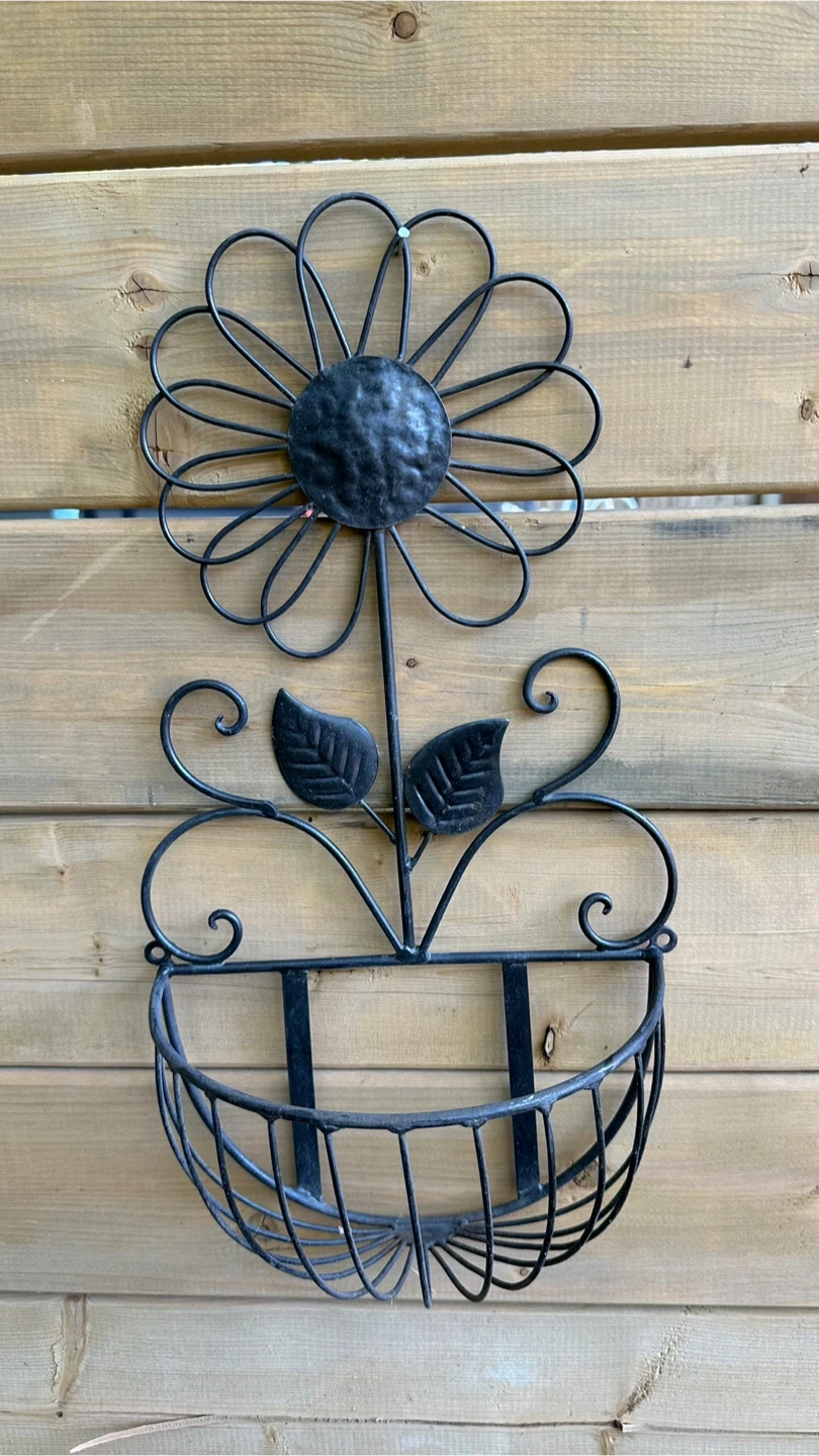 22Here's a cute metal flower basket for fence decor in your garden. It's a unique piece to add some charm to your garden space. The basket is perfect for holding small potted plants or other decorative items. It's in great condition and ready to find a new home! Porch pick up Smoke free Woodbine and Lumsden