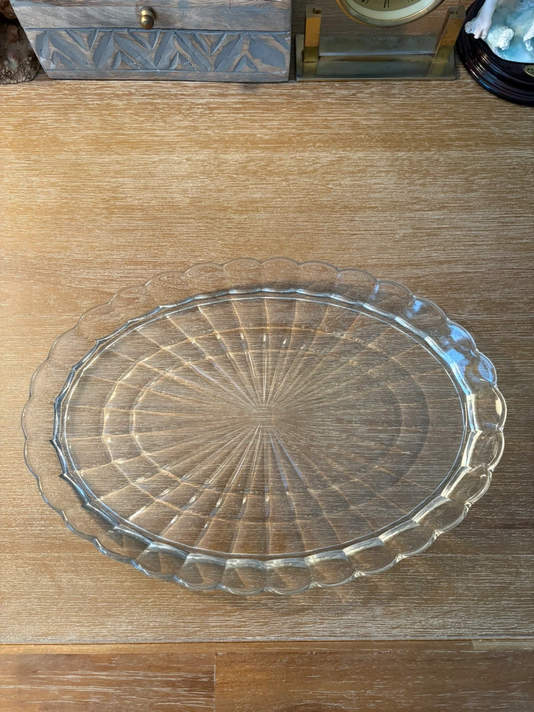 Selling a clear glass oval serving platter. It's crack and chip free with a raised scalloped edge, ready to display your culinary creations or use on your dresser for jewelry, perfume bottles etc. measures 12 x81/2 inches. Cash only