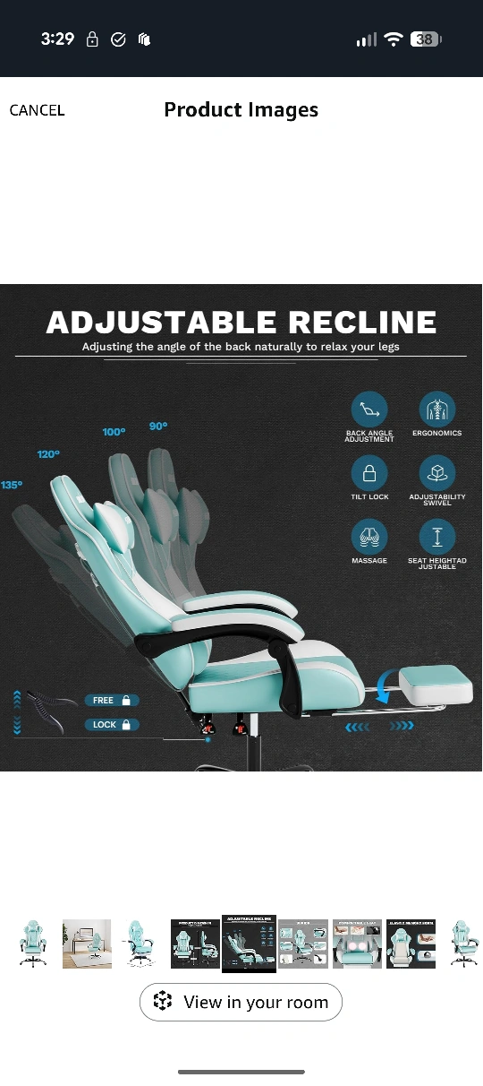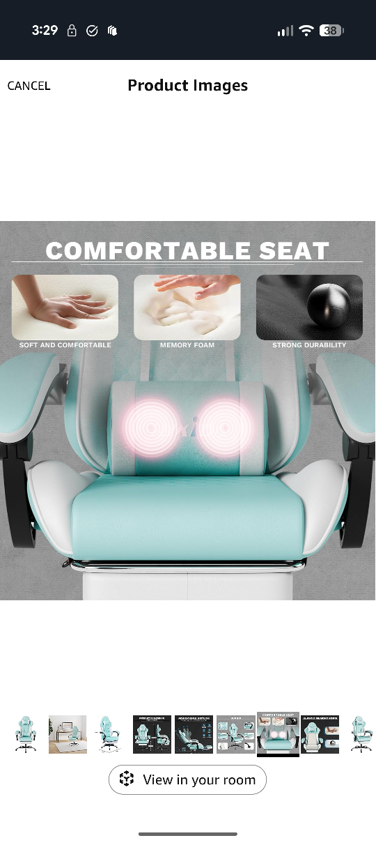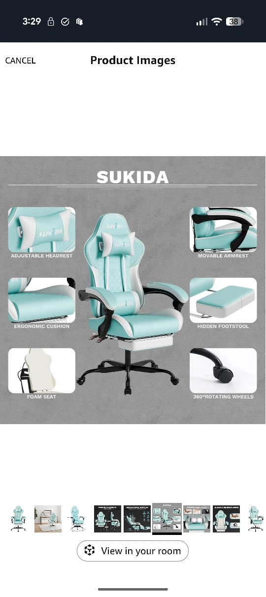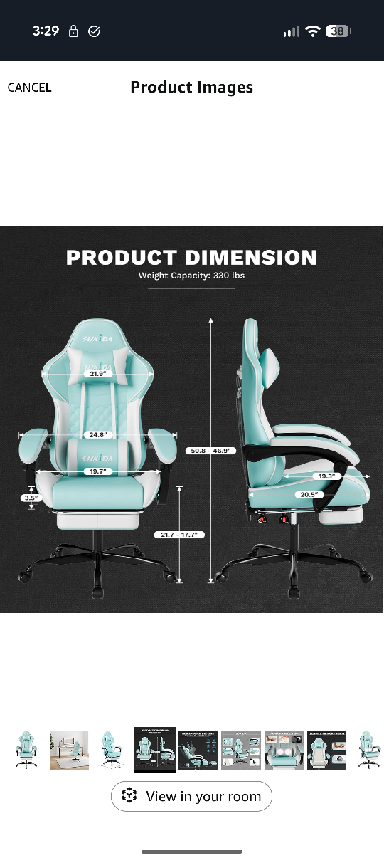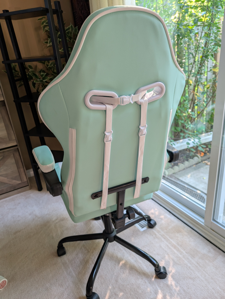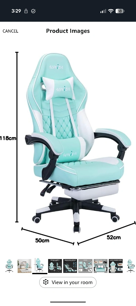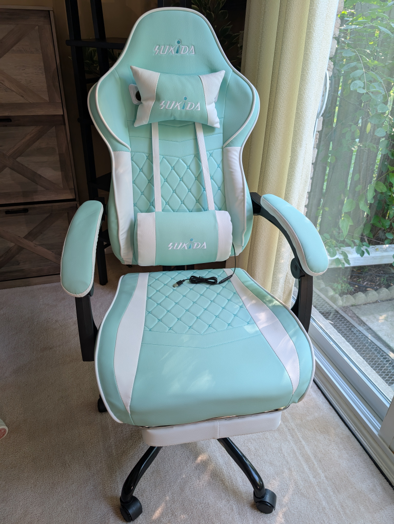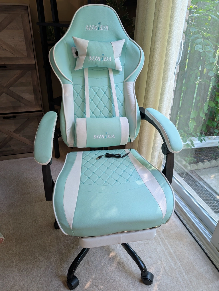 Looking to upgrade your gaming setup? I'm selling a SUKIDA gaming chair in a refreshing mint green colour. It features an adjustable recline to help you relax and adjustable height. The chair also has a massage function and a footrest for extra comfort during those long gaming sessions! The weight capacity is 330 lbs. Dimensions are 118cm height, 50cm width, and 52cm depth